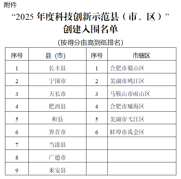 ●12月2日,安徽省科技厅网站公示2025年度科技创新示范县(市、区)创建入围名单。详情>>>