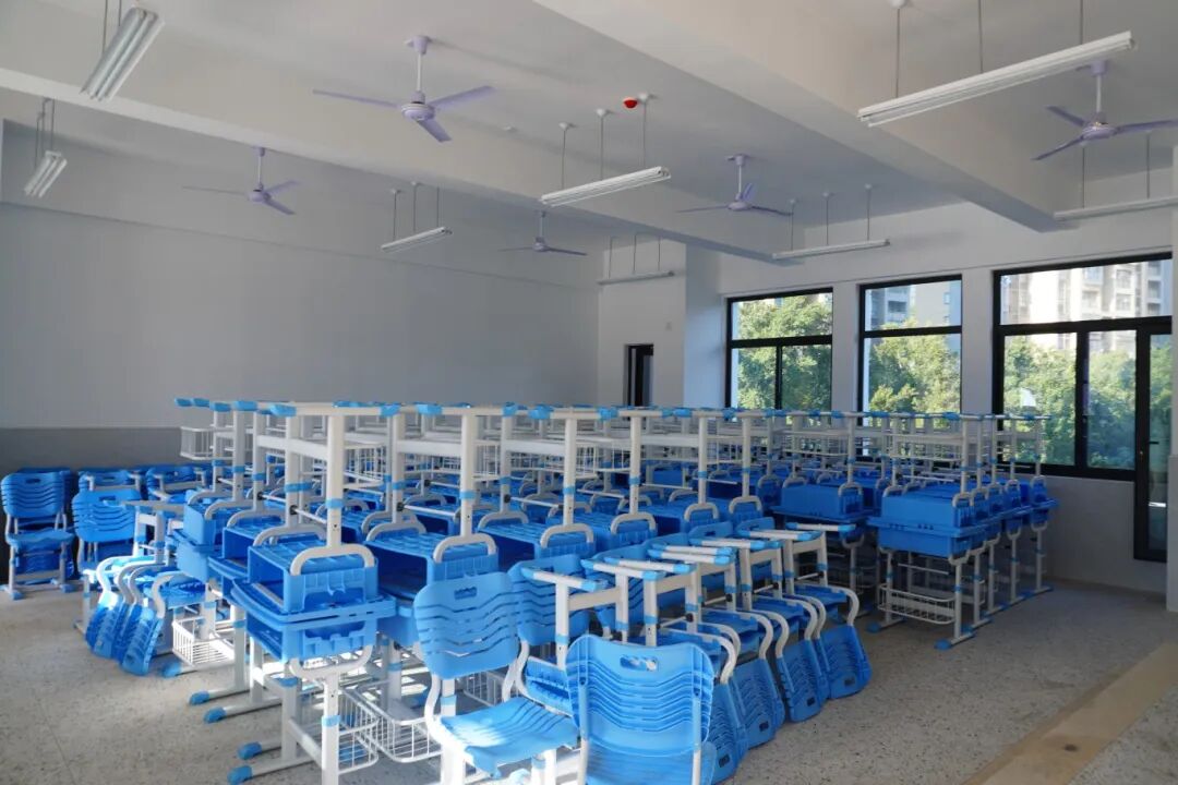 记者在现场看到,一栋崭新建筑在校园内巍然矗立,共包含地上5层教学楼与地下1层空间。课间时分,不少学生在操场上,难掩期待,张望着新大楼。走进教学楼内部,工人们正忙着搬运、安装各类教学设备,沿楼梯逐层而上,教学班内的灯光、风扇已安装完毕,部分课桌椅也已入场,明亮整洁的空间已初见校园模样。据了解,扩容工程新建的建筑面积达11278.49平方米,建设内容涵盖土建、装饰、电气及照明、给排水、弱电系统等主体工程,同时配套完善室外设施与景观绿化。