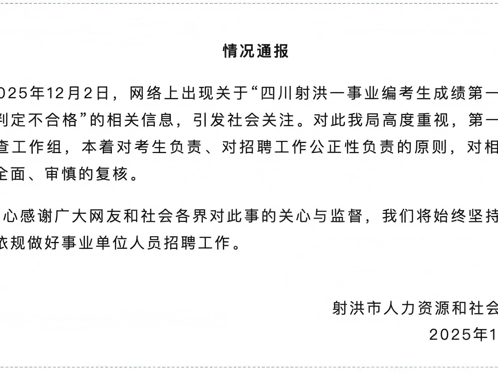2025年12月2日,网络上出现关于“四川射洪一事业编考生成绩第一,被卫健局判定不合格”的相关信息,引发社会关注。对此我局高度重视,第一时间成立调查工作组,本着对考生负责、对招聘工作公正性负责的原则,对相关情况进行全面、审慎的复核。