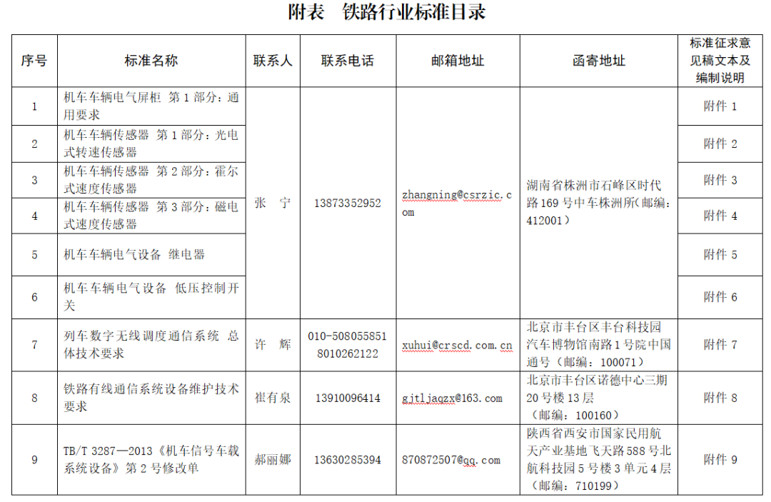 根据铁路行业技术标准管理办法的相关要求,现就《机车车辆电气屏柜 第1部分:通用要求》(征求意见稿)等9项铁路行业标准和标准修改单公开征集意见(见附表和附件1—9)。请于2026年1月3日前将《铁路行业标准征求意见表》(见附件10)通过电子邮件或信函方式实名提出反馈意见,逾期视为无意见。