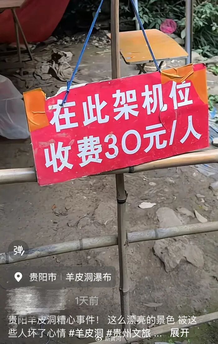 根据网友发布的视频画面显示,在距离瀑布不远处有一个用竹竿搭建起来的简易棚,棚内摆有桌子。写有“在此架机位收费30元/人”的牌子便悬挂在围栏上。“羊皮洞这么好看的景,还是免费的,凭什么挂一个牌子就得收30块钱。”该网友发布视频质疑羊皮洞景区存在乱收费的现象。