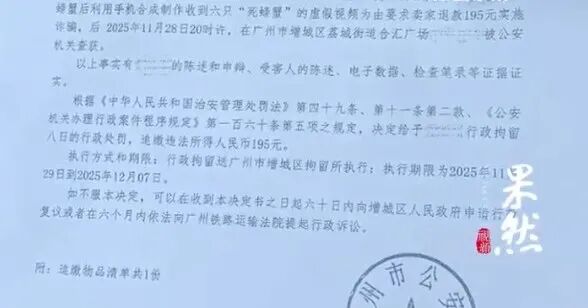 根据《广州市公安局增城区分局行政处罚决定书》显示,该当事人于2025年11月17日,购买八只螃蟹,收到螃蟹后利用手机合成制作收到六只“死螃蟹”的虚假视频,要求商家退款195元,实施诈骗。该当事人11月28日被公安机关查获。根据相关法规,决定给予该当事人行政拘留八日的行政处罚,追缴违法所得人民币195元。