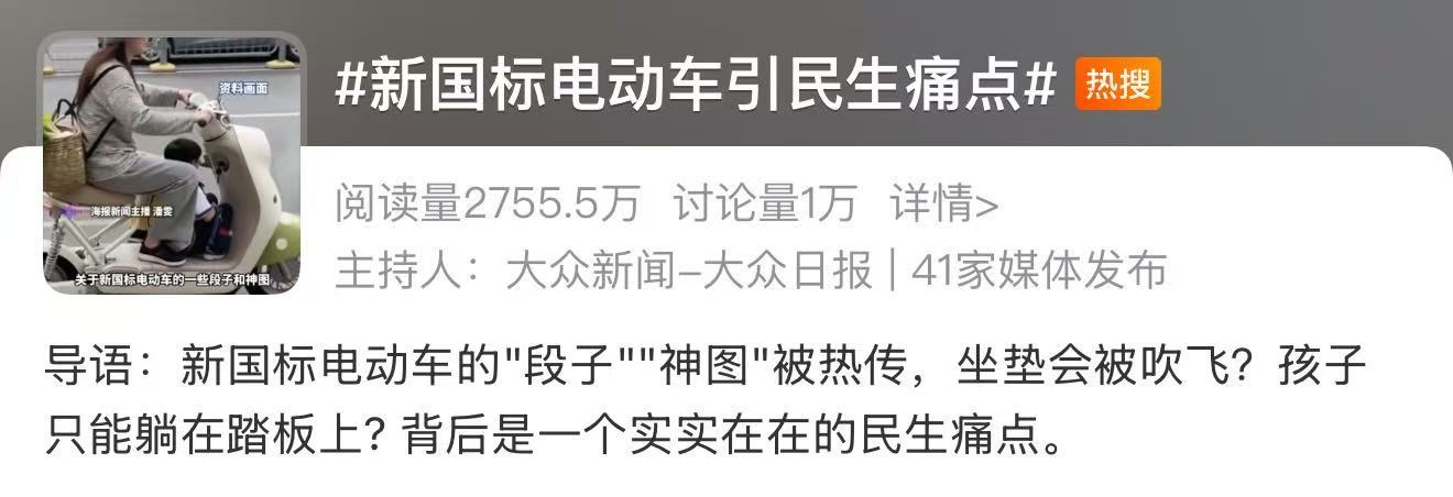 旧国标电动车全面禁售,新上线的新国标电动车却引发网友吐槽。相关话题登上网络热搜。