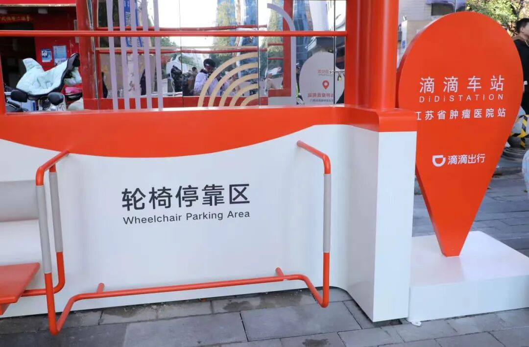 走近站点仔细观察,处处能看到为患者贴心设计的细节:整个站点占地约75平方米,被清晰划分成“即停即走区”和“患者等候区”两大功能区。其中,“网约车即停即走区”用醒目的橙色喷漆划定专属停车位。站台内“等候区”有8个座位,椅面宽大且带有扶手,方便行动不便的患者倚靠,还贴心地设计了两个儿童车位。