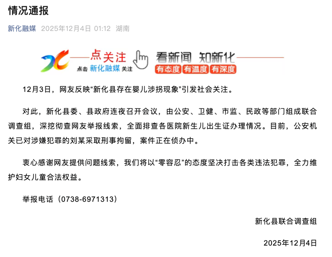 通报称,12月3日,网友反映“新化县存在婴儿涉拐现象”引发社会关注。