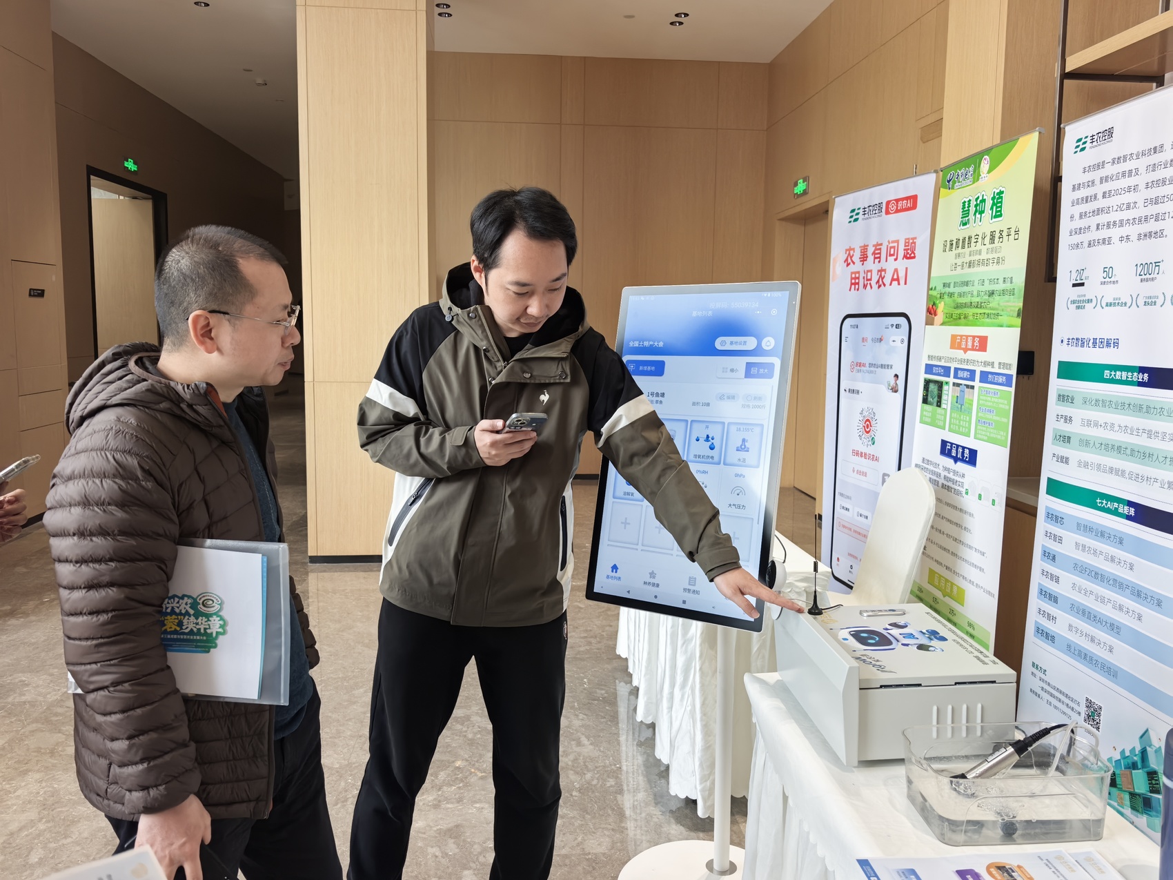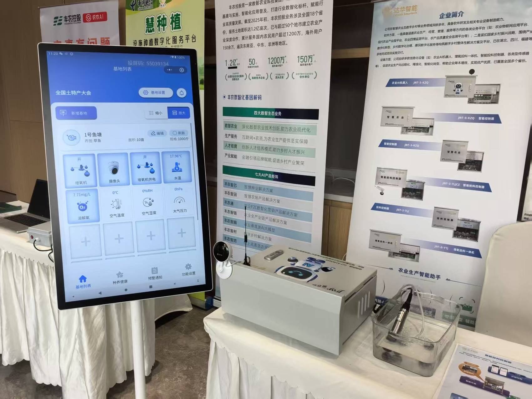 此时,参展企业达华智能的产品总监李杨正为嘉宾讲解AI智能控制设备的优势。“系统可以判断什么时候向鱼塘增氧、投料效果最佳,并给养殖户提出建议。”他一边切换着投屏小程序上的系统页面,一边挪步靠近嘉宾,提高音量说。