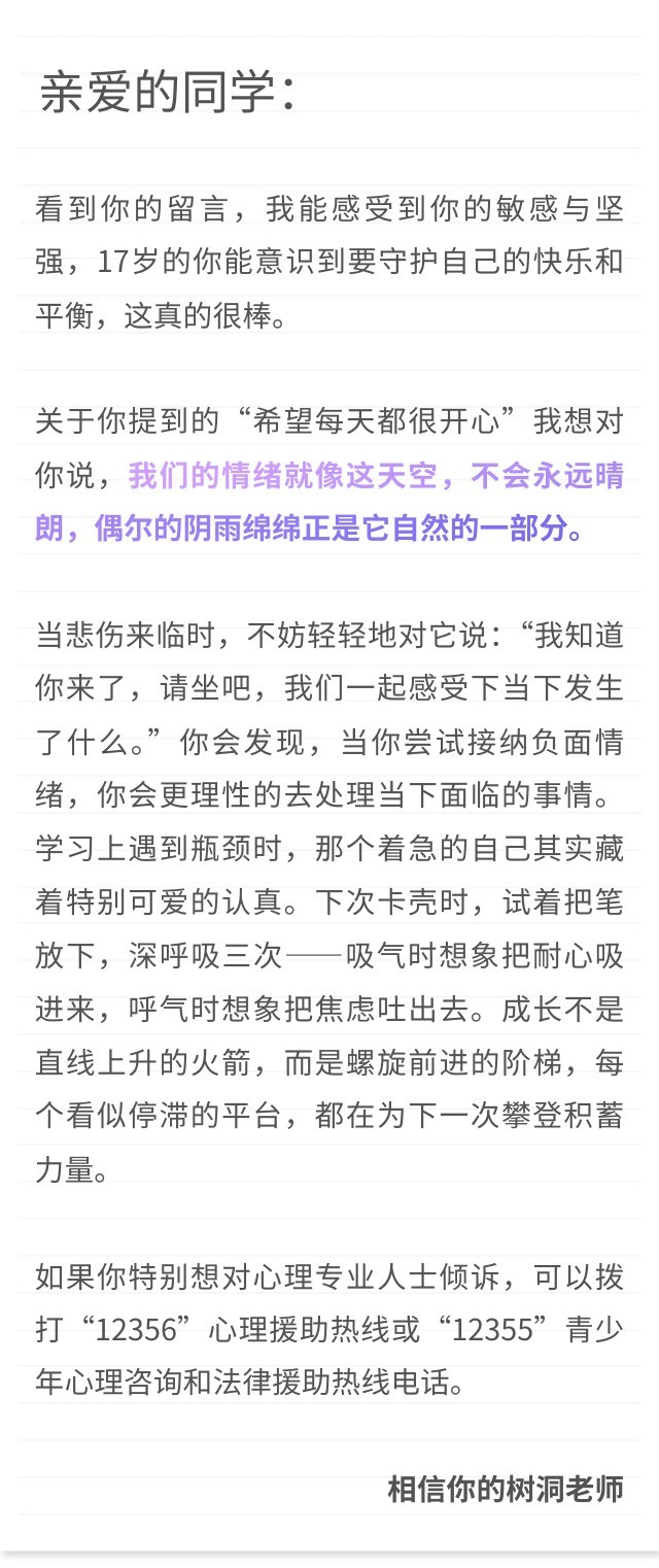 一位17岁的高中女生:我希望自己每天都开开心心的,不希望自己因为一些小事就悲伤,希望学习上不会的也不要着急,稳住自己的心态,我要自己每天都保持开心。