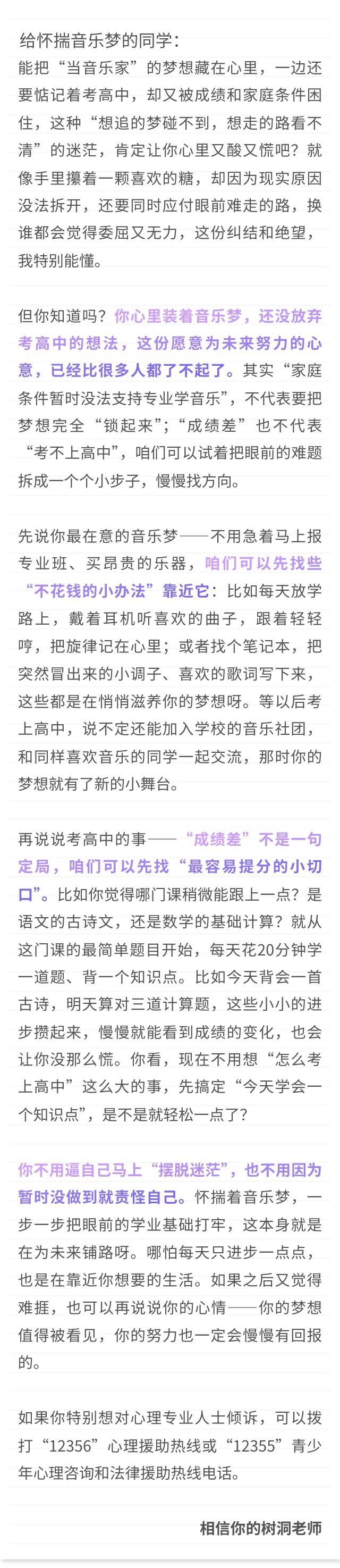 一个14岁的初中男生:我有一个梦想,我想当音乐家,想学音乐。但是因为家庭条件不得不把这个梦想压在心底。我也想考高中,但是我成绩差,不知道怎么办,现在很迷茫有点绝望。