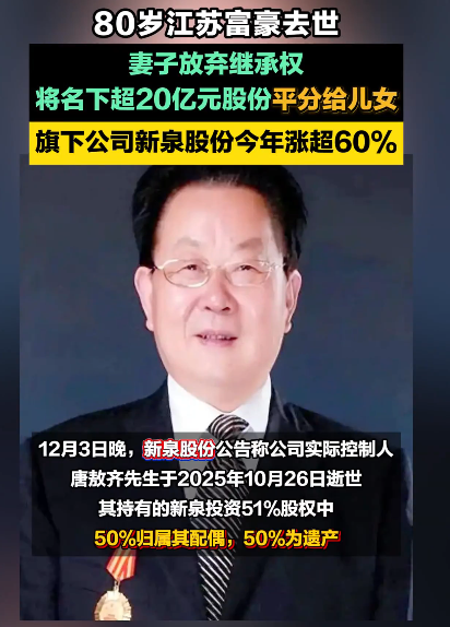 12月3日晚,新泉股份(603179.SH,市值349亿元)公告称,公司实际控制人唐敖齐先生于2025年10月26日逝世,其持有的新泉投资51%股权中50%归属其配偶,50%为遗产。