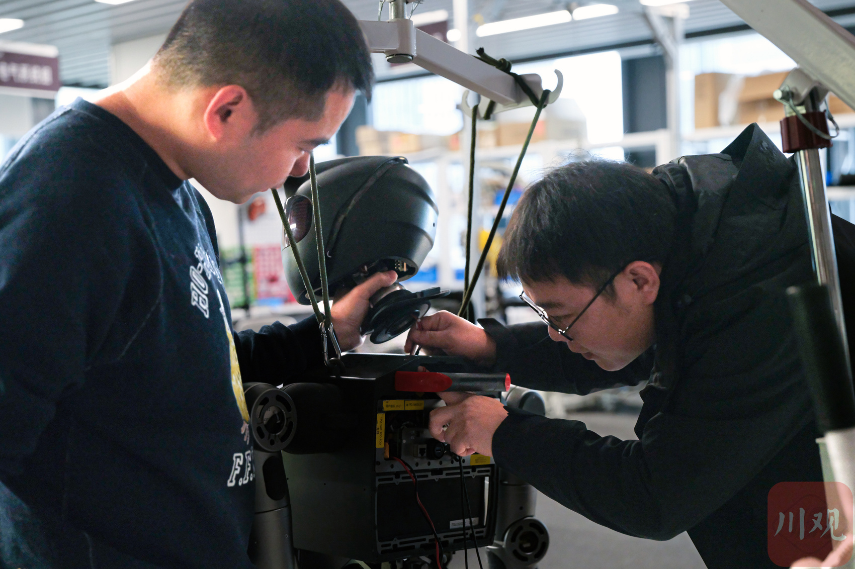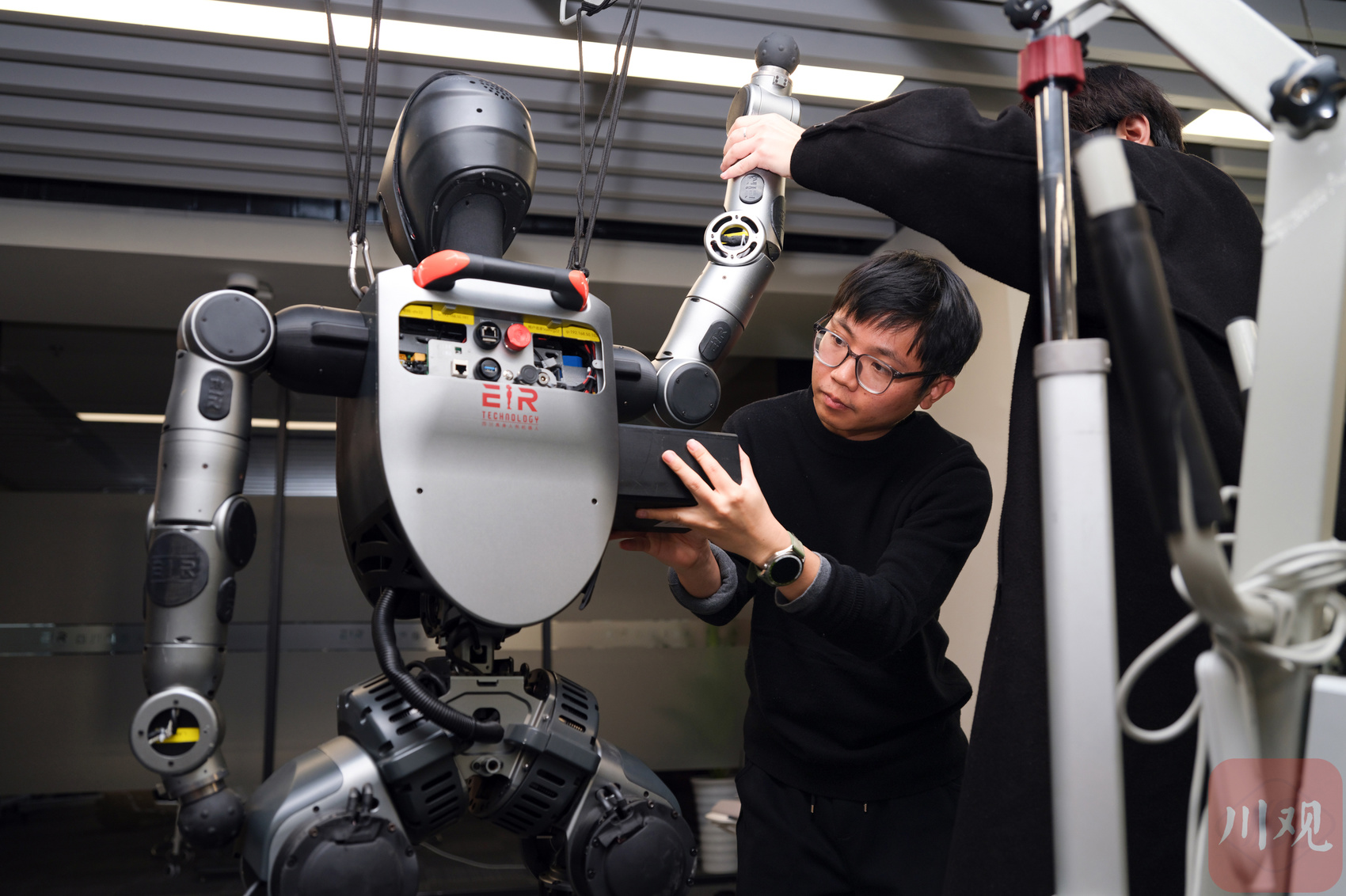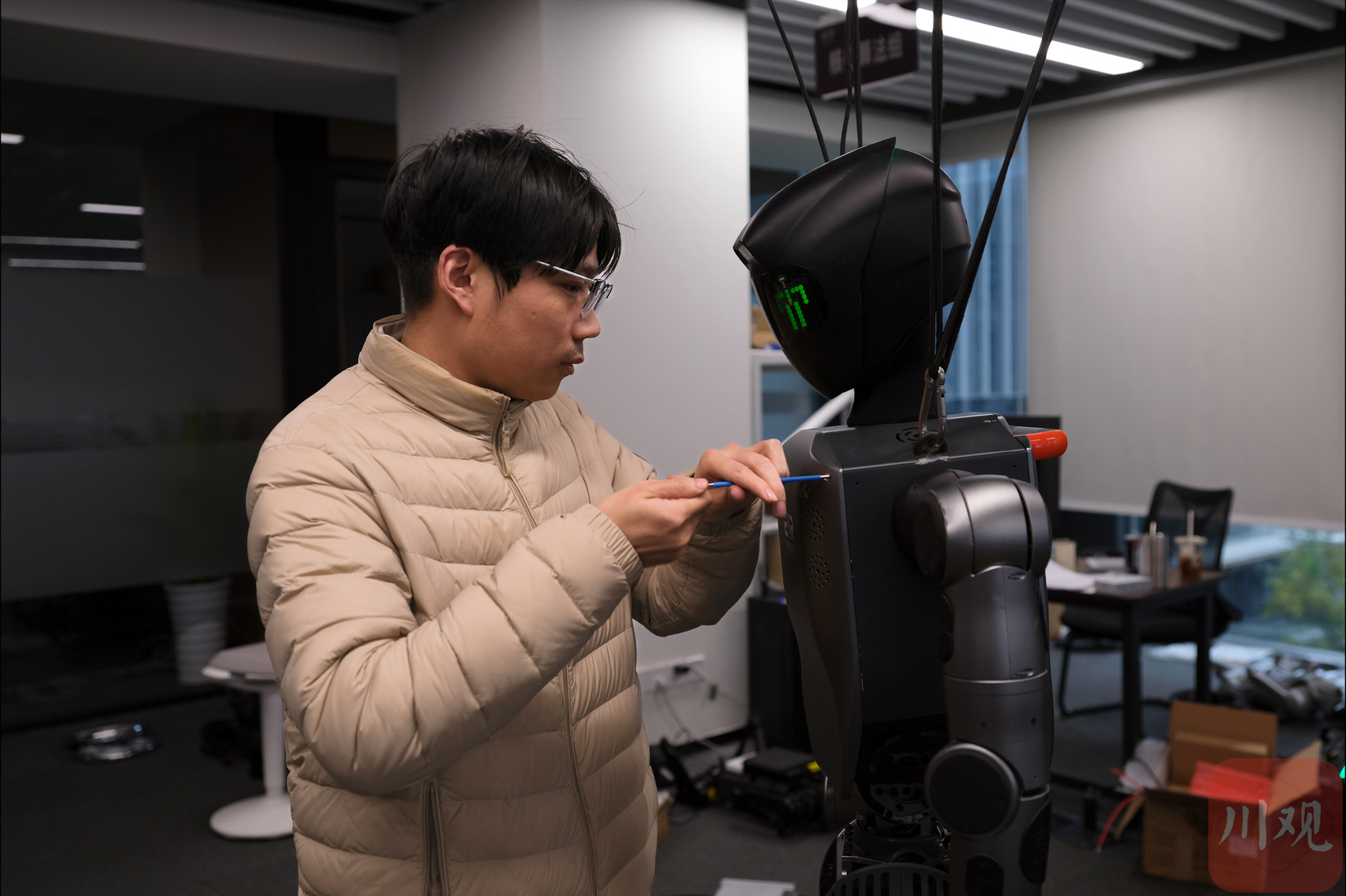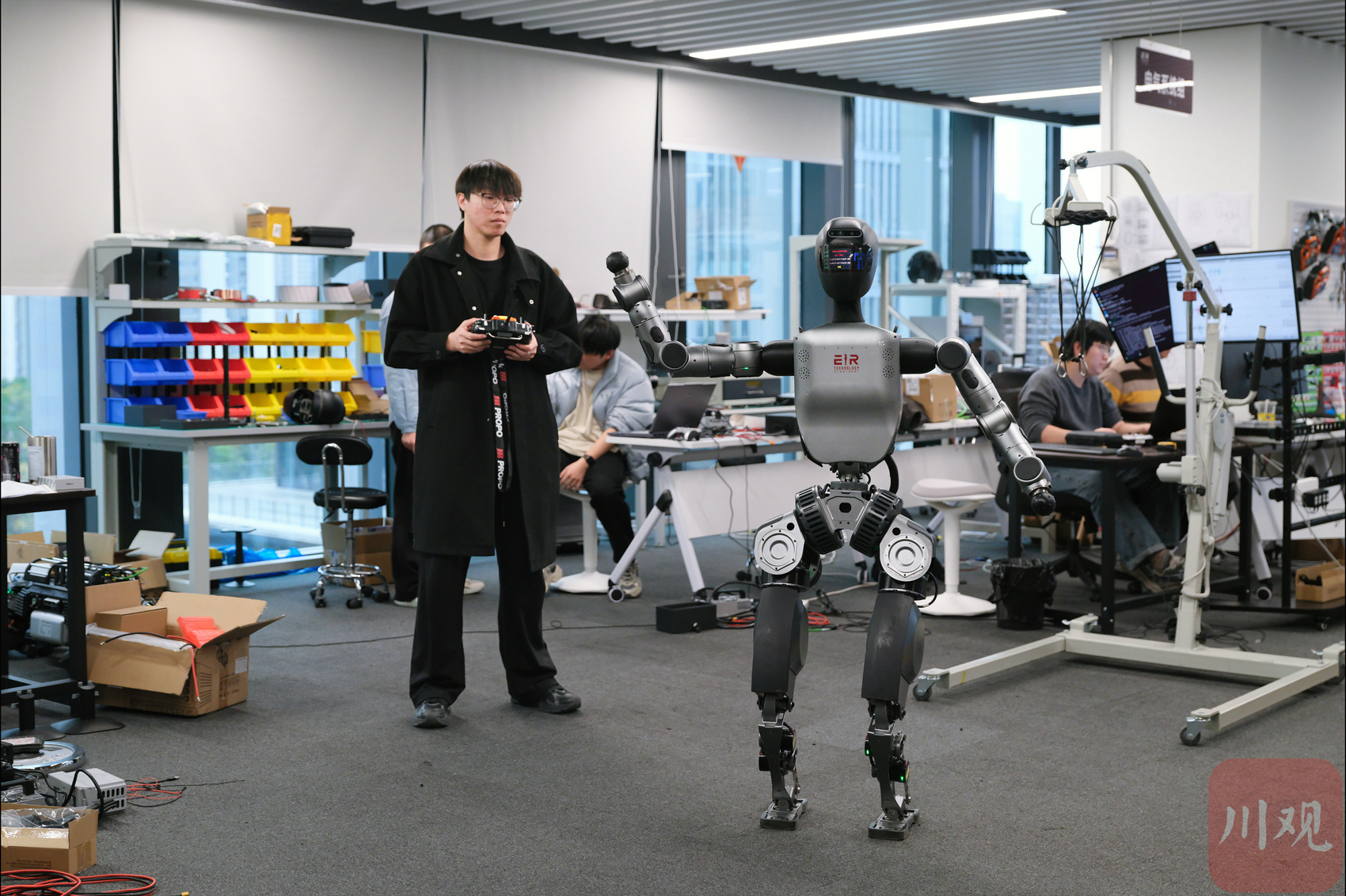成都研发的人形机器人在实验室进行行走测试,工程师同步监测其运动数据。