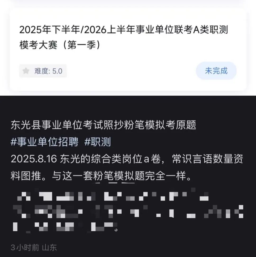 8月18日,记者通过整理网友评论发现,东光县事业单位公开招聘考试部分试题疑“照抄照搬”粉笔APP2025年下半年/2026年上半年事业单位联考A类职测模考大赛(第一季),记者随后联系到粉笔APP客服,据其介绍,该套模拟题于7月18日上线。