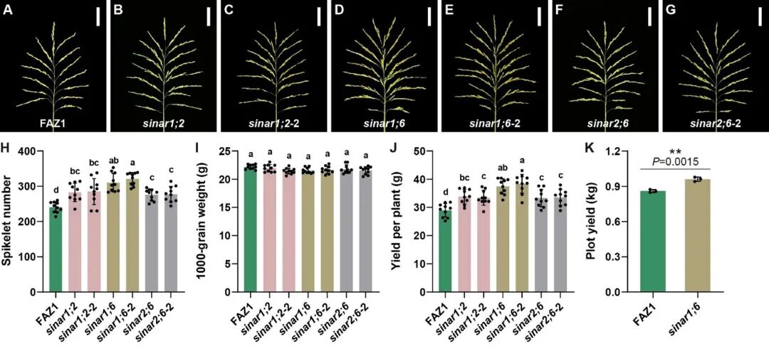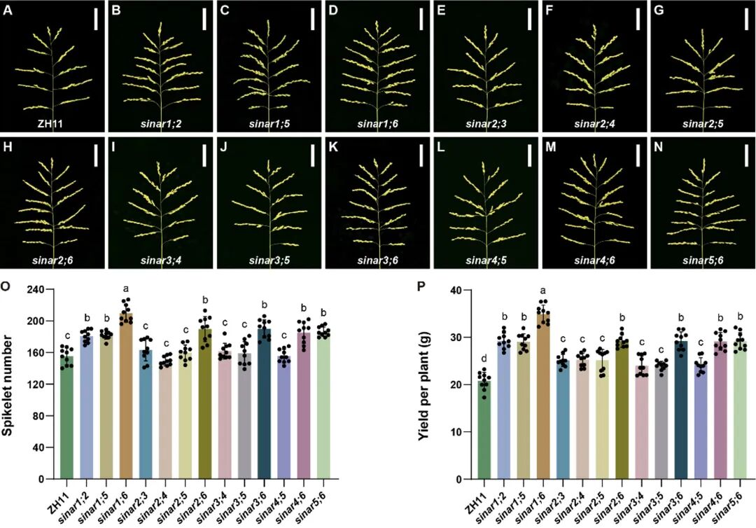 图1. 水稻SINAR基因家族双突变体的穗型结构及产量性状比较(中花11背景)