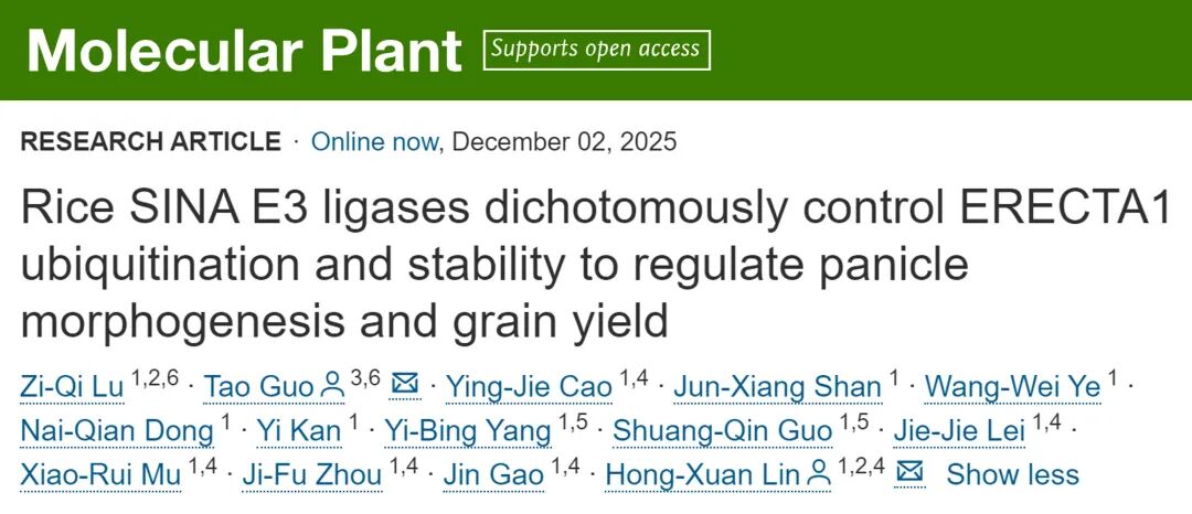 2025年12月3日,中国科学院分子植物科学卓越创新中心林鸿宣院士团队与西北农林科技大学未来农业研究院郭韬教授团队合作在国际知名学术期刊Molecular Plant在线发表了题为“Rice SINA E3 ligases dichotomously control ERECTA1 ubiquitination and stability to regulate panicle morphogenesis and grain yield”的研究论文。该研究揭示了水稻E3泛素连接酶家族SINARs通过二元调控类受体激酶OsER1稳态塑造水稻高产理想穗型的分子机制,并通过特异性敲除该家族中一类特殊的兼具拮抗功能的关键节点基因SINAR1和SINAR6,成功打破了水稻产量性状之间的偶联性,为作物高产育种提供了新的分子模块和思路。