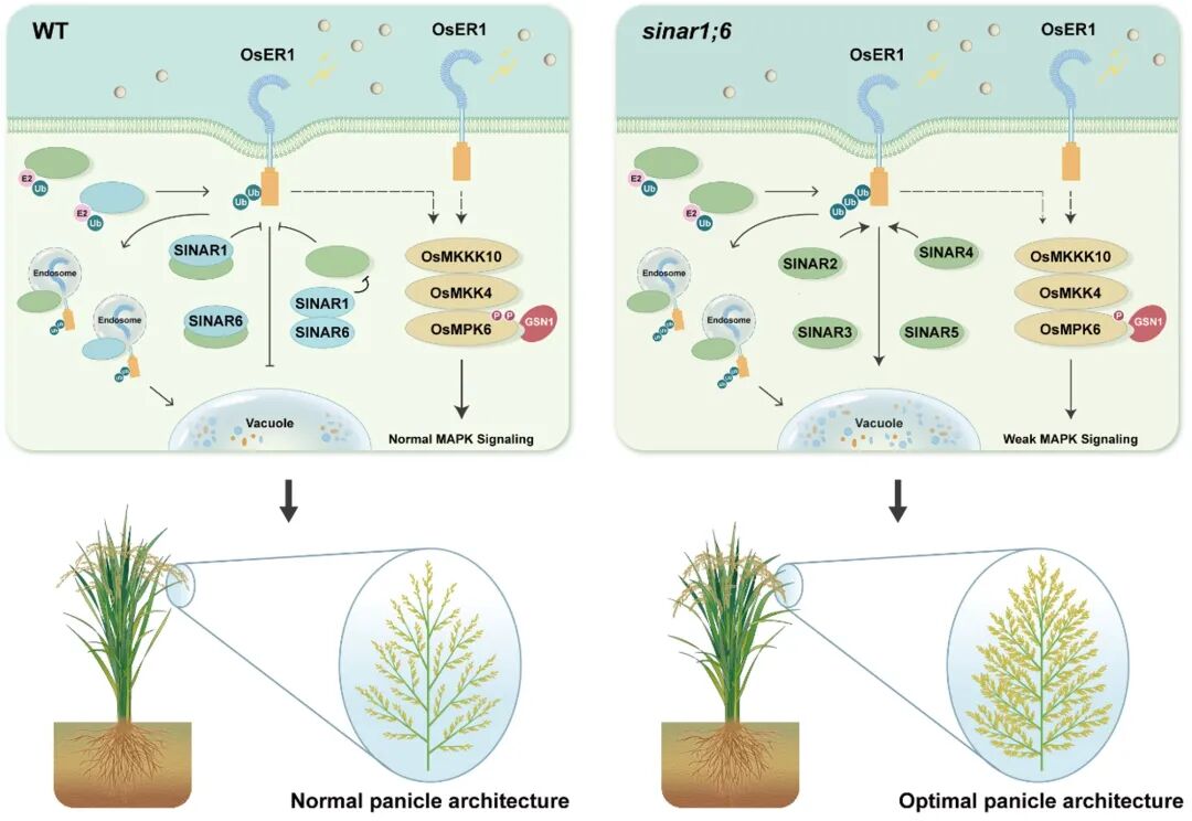 综上所述,该研究不仅揭示了E3泛素连接酶家族SINARs通过调控类受体激酶OsER1泛素化与稳态控制作物花序形态建成的分子遗传机理,并且发现了泛素化介导植物类受体激酶液泡降解的二元调控机制。在此基础上提出了一种合理的分子设计思路,即通过特异性敲除关键结点基因SINAR1和SINAR6克服了复杂性状之间的偶联和权衡效应,为未来作物分子设计育种提供新的理论基础和基因资源。