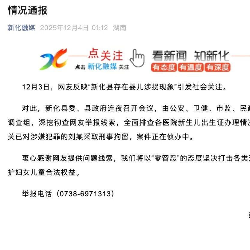 12月3日,网友反映“新化县存在婴儿涉拐现象”引发社会关注。对此,新化县委、县政府连夜召开会议,由公安、卫健、市监、民政等部门组成联合调查组,深挖彻查网友举报线索,全面排查各医院新生儿出生证办理情况。目前,公安机关已对涉嫌犯罪的刘某采取刑事拘留,案件正在侦办中。衷心感谢网友提供问题线索,我们将以“零容忍”的态度坚决打击各类违法犯罪,全力维护妇女儿童合法权益。