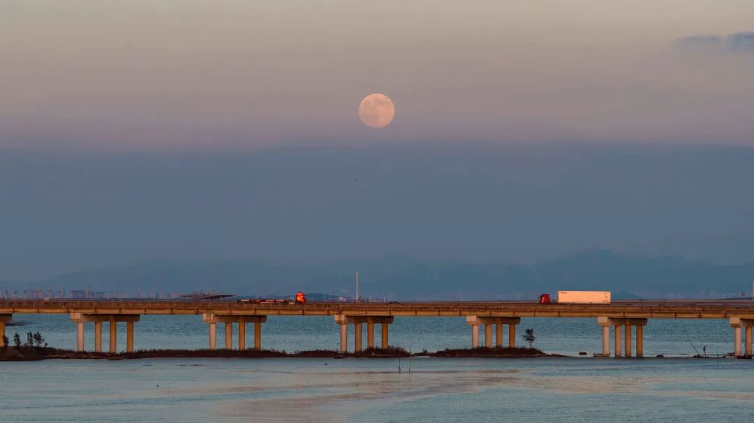 △2025年11月5日,山东青岛市西海岸新区红石崖街道,“超级月亮”辉映洋河河海大桥。