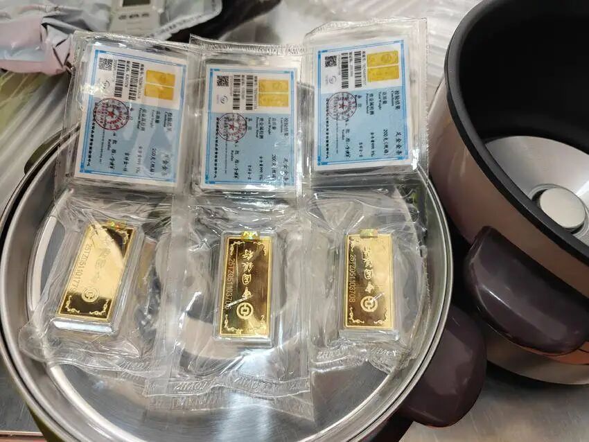 “600克黄金装在电饭煲内,将于今天上午9时许到达快递站。”11月28日,专班民警迅速前往快递站点将“电饭煲”及时截下。经现场开箱检查,电饭煲底座内藏有3块用锡纸严密包裹的黄金金条,总重量达600克。