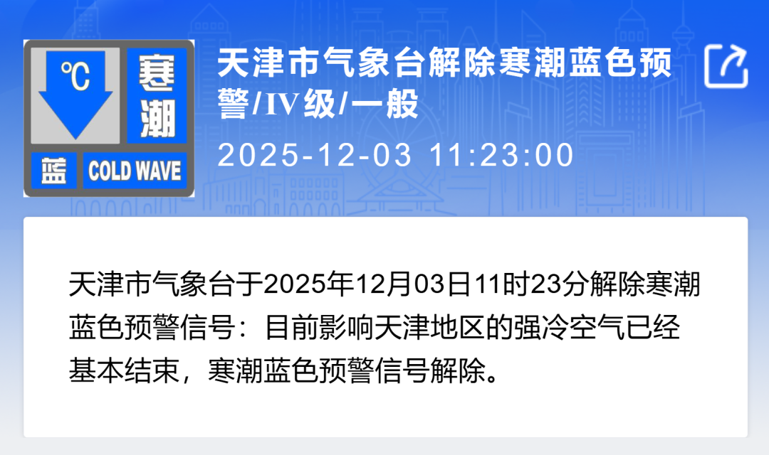 天津市气象台于2025年12月03日11时23分解除寒潮蓝色预警信号:目前影响天津地区的强冷空气已经基本结束,寒潮蓝色预警信号解除。