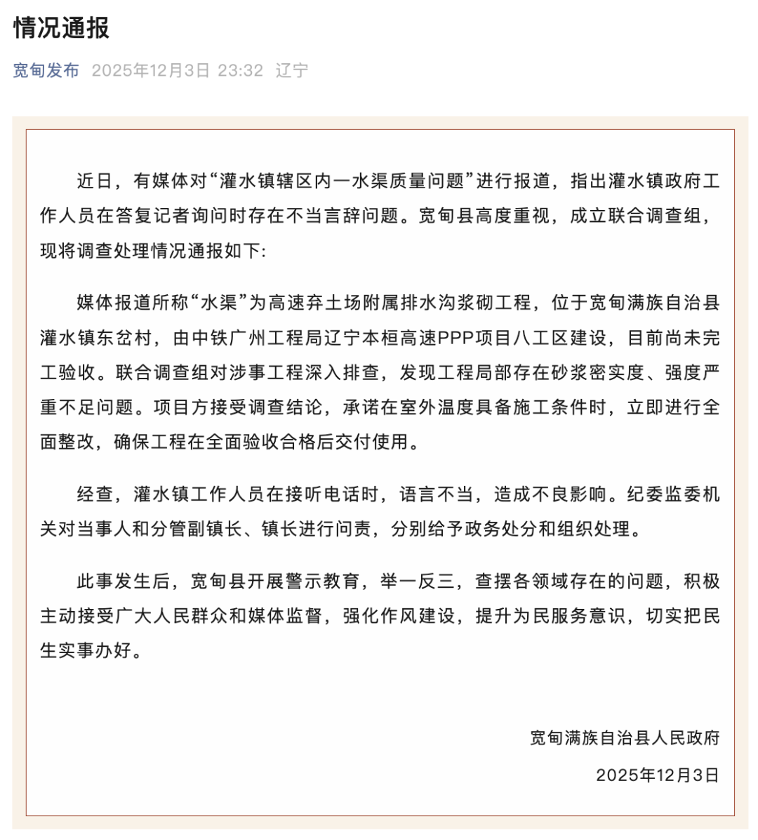 12月3日晚,辽宁丹东宽甸满族自治县人民政府发布情况通报:近日,有媒体对“灌水镇辖区内一水渠质量问题”进行报道,指出灌水镇政府工作人员在答复记者询问时存在不当言辞问题。宽甸县高度重视,成立联合调查组,现将调查处理情况通报如下: