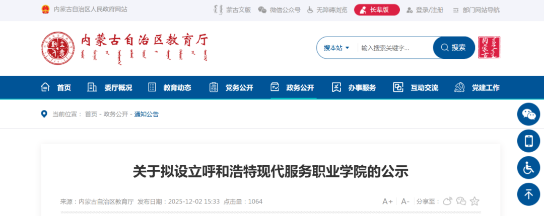 为推动落实《内蒙古自治区“十四五”高等学校设置规划》,根据《中华人民共和国高等教育法》《高等学校设置标准(试行)》《教育部关于“十四五”时期高等学校设置工作的意见》等有关规定,经自治区高等学校设置评议专家组考察评议,自治区教育厅党组会议研究通过,现对拟提请自治区人民政府审批设立呼和浩特现代服务职业学院事项予以公示。