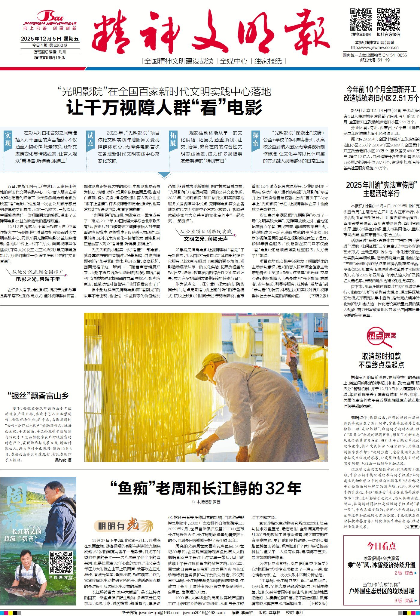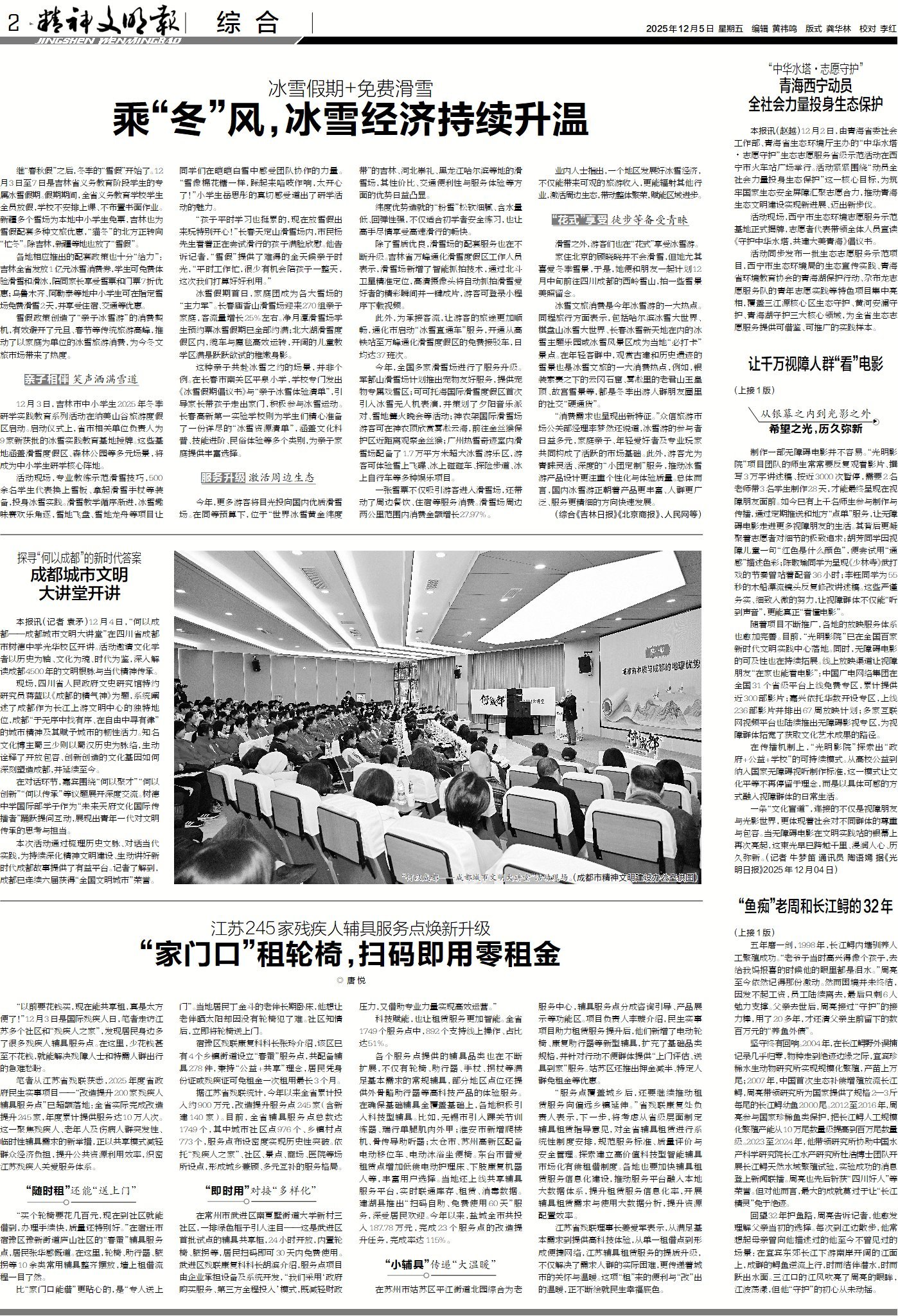 今日版面“早”知道:1版头条聚焦第34个国际残疾人日,“光明影院”依托百家实践中心开展无障碍电影公益放映,助力视障群体共享文化空间;《热点观察》直击外卖配送管理改革,相关模式引发热议;2版关注多地推行“雪假”新政,催生亲子冰雪游热潮,激活今冬文旅市场;3版“深读”剖析徒步登山风潮下的生态困境,探讨破解管理真空与垃圾围城、平衡个人行为与公共责任的必答题。