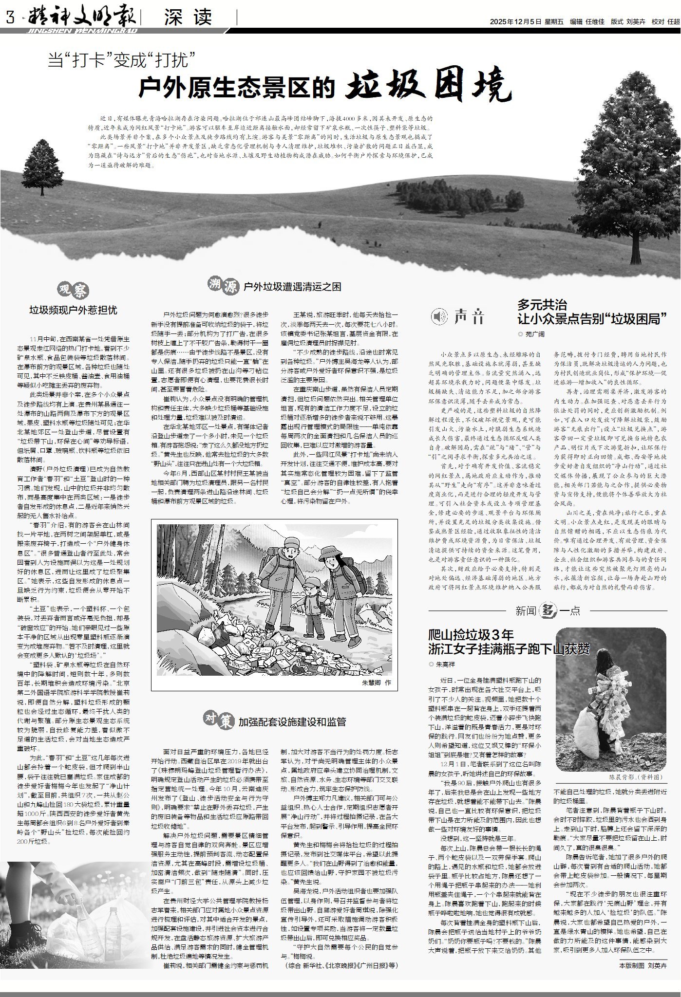 当登山、徒步成为风潮,徒步路线与小众景点正陷入管理真空与垃圾围困的双重困境。这不仅撕开了生态保护的“隐形伤疤”,更反应出个人行为与公共责任间的矛盾。破解之道,既需刚性制度的约束与精细化的管理填补空白,也离不开每一次弯腰拾起与自觉带走的绿色公民行动。本期3版“深读”探讨横亘在“诗与远方”与现实之间的必答题。