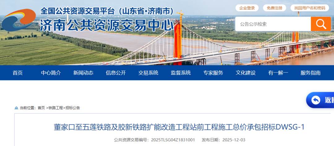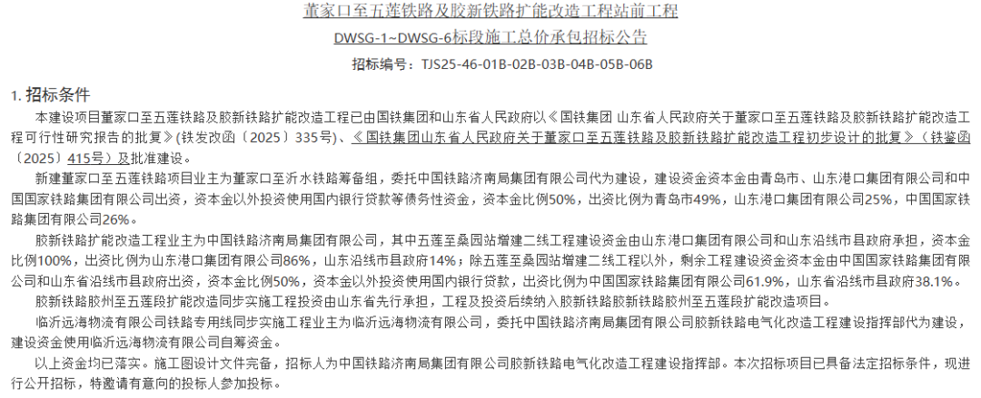 12月3日,董家口至五莲铁路及胶新铁路扩能改造工程站前工程施工总价承包招标公告发布。项目将于12月底正式开工建设,工期2.5年,计划2028年6月底竣工,项目估算总投资183.1亿元。