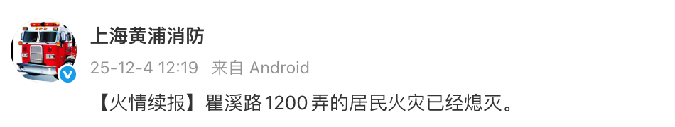 12时19分,@上海黄浦消防 发通报称“瞿溪路1200弄的居民火灾已经熄灭。 ”