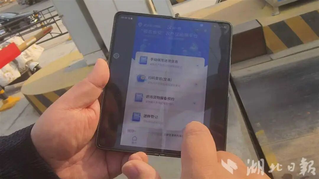 在黄陂新华南批发市场,入场车辆需通过“武汉农品追溯”小程序提前登记信息。智能门禁系统自动识别后,已登记的车辆快速通行;未登记的车辆则需现场抽样并接受快检,合格后方可入场。