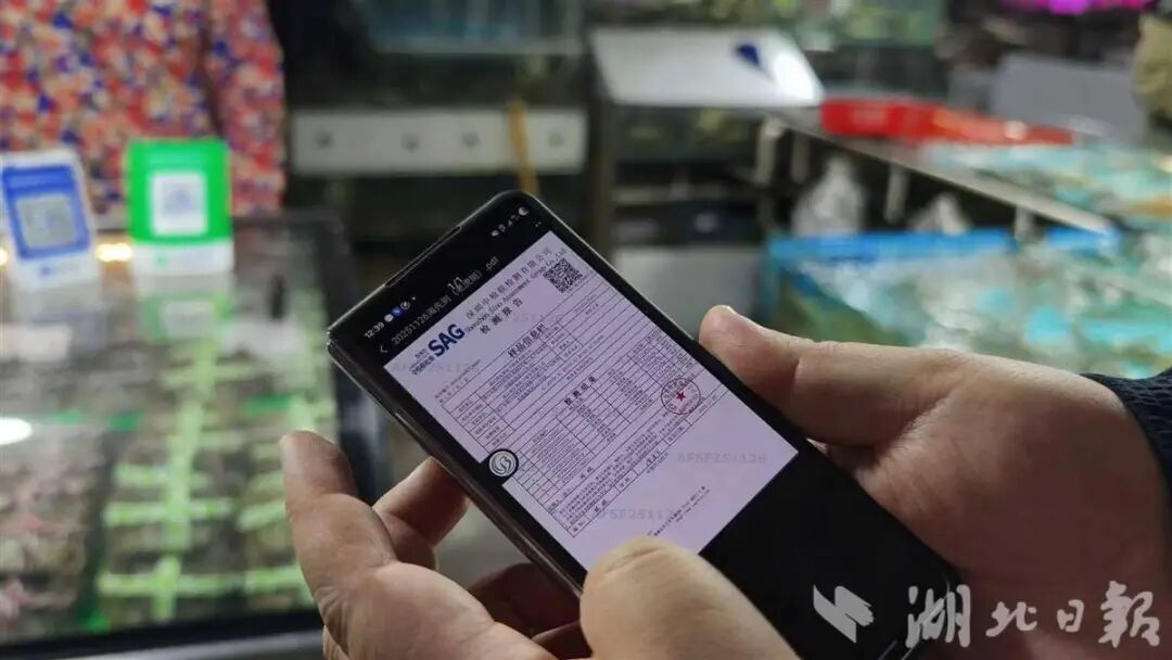 市民李先生扫码后,看到活虾来自江夏区水产养殖基地,还有水质检测合格证明,笑着说:“以前买水产怕不新鲜,现在知道来路,买得更痛快。”
