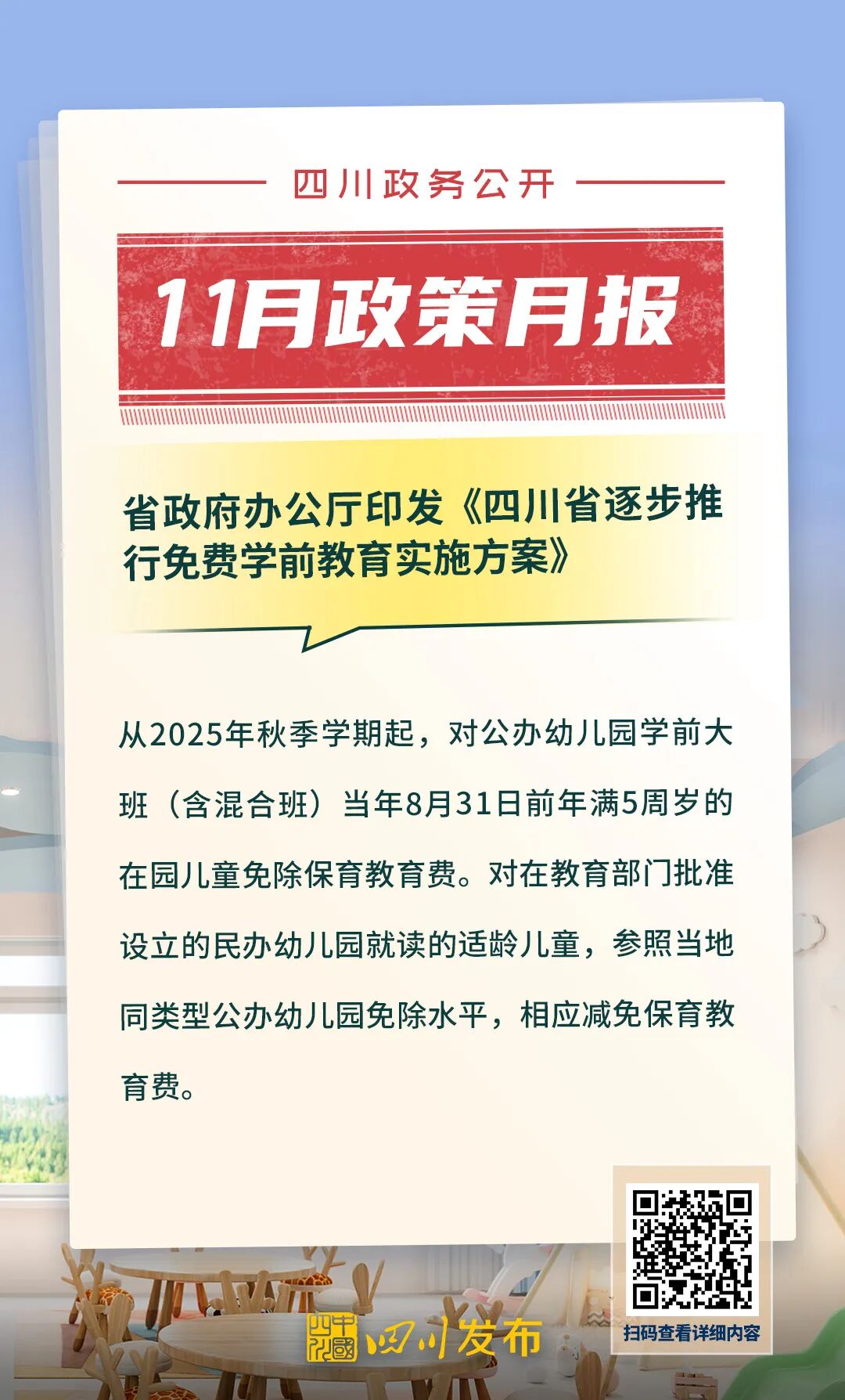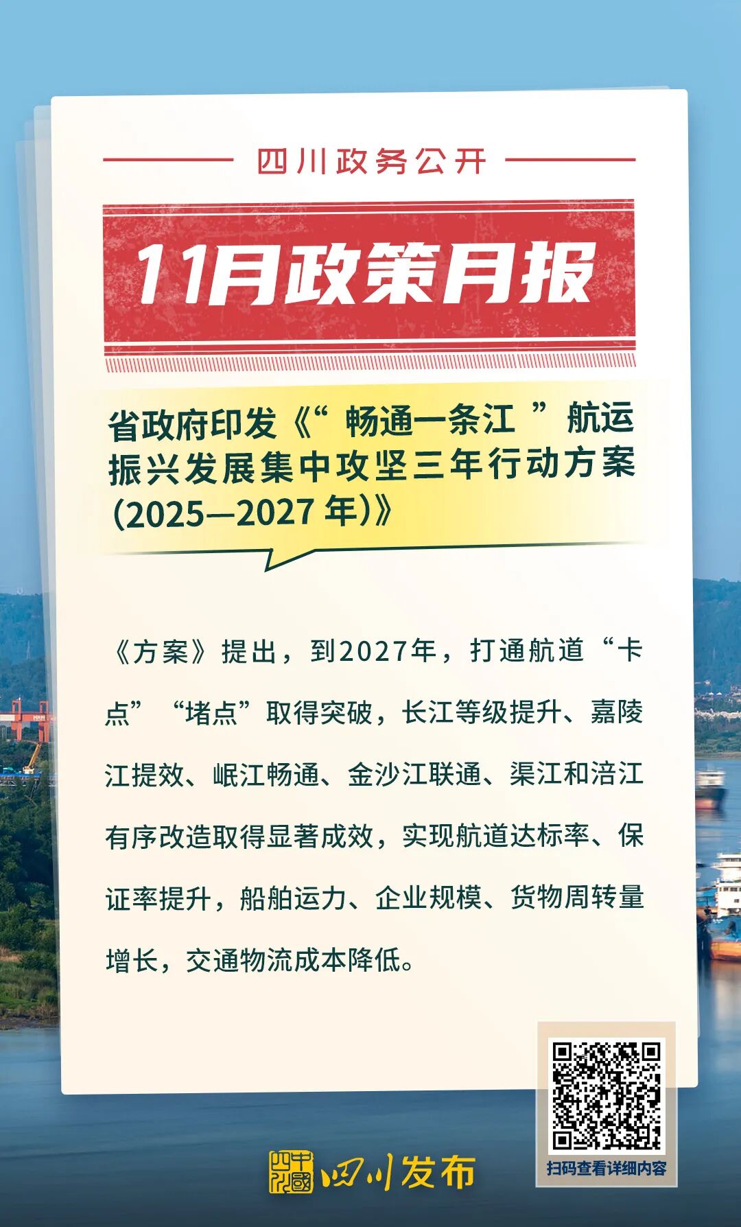 四川省人民政府2025年11月出台了多项重要政策。其中,涉及“畅通一条江”航运振兴发展、“高效办成一件事”重点事项常态化推进、加快提升农业社会化服务水平、逐步推行免费学前教育、遏制与防治艾滋病、民兵权益保障和优待办法等重要方面。