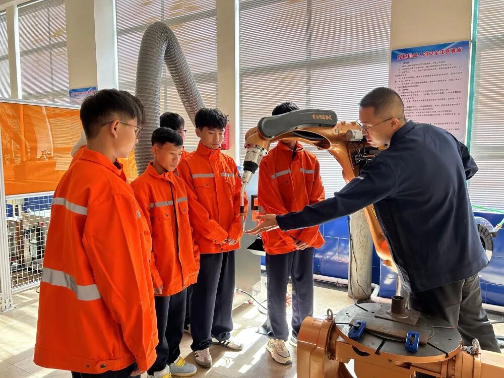 临沧技师学院焊接教师指导学生操作焊接机器人。临沧市委宣传部 供图