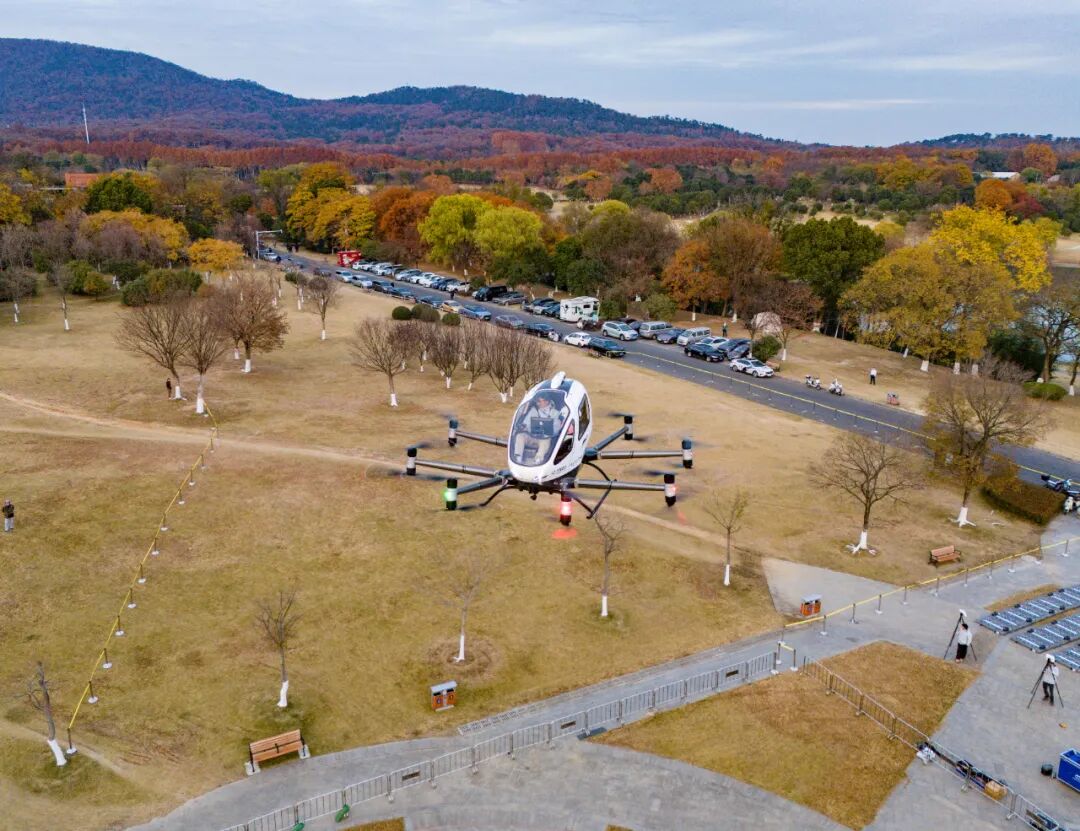 当天下午,在南京市“钟山首飞·万有启航”应用场景观摩会暨紫金山eVTOL首次载人飞行仪式现场,停在起降坪上的“主角”——无人驾驶载人eVTOL航空器EH216-S,格外引人注目。