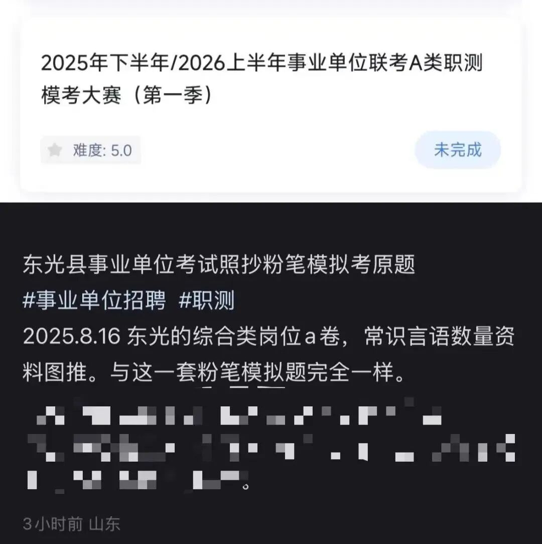 此前,东光县事业编考题因与培训App模拟卷题目高度重合引发关注。