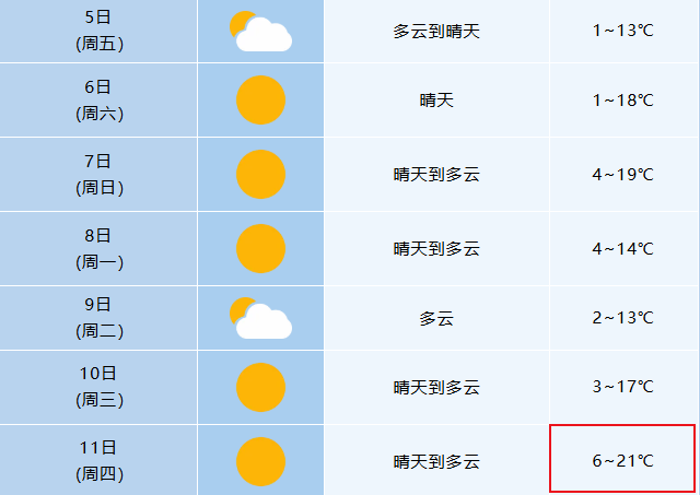 未来几天全省以多云到晴天气为主5日起全省气温回升7日淮河以北和大别山区最高气温14~17℃其他地区17~21℃8-9日受冷空气影响,全省气温略有下降10日后全省气温再次回升