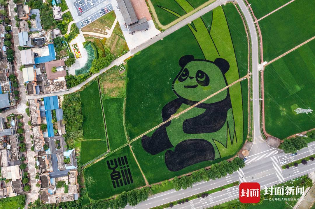 四川省崇州市,从高空俯瞰稻田里“禾下乘凉”的大熊猫。大熊猫图案由不同品种的水稻组成。