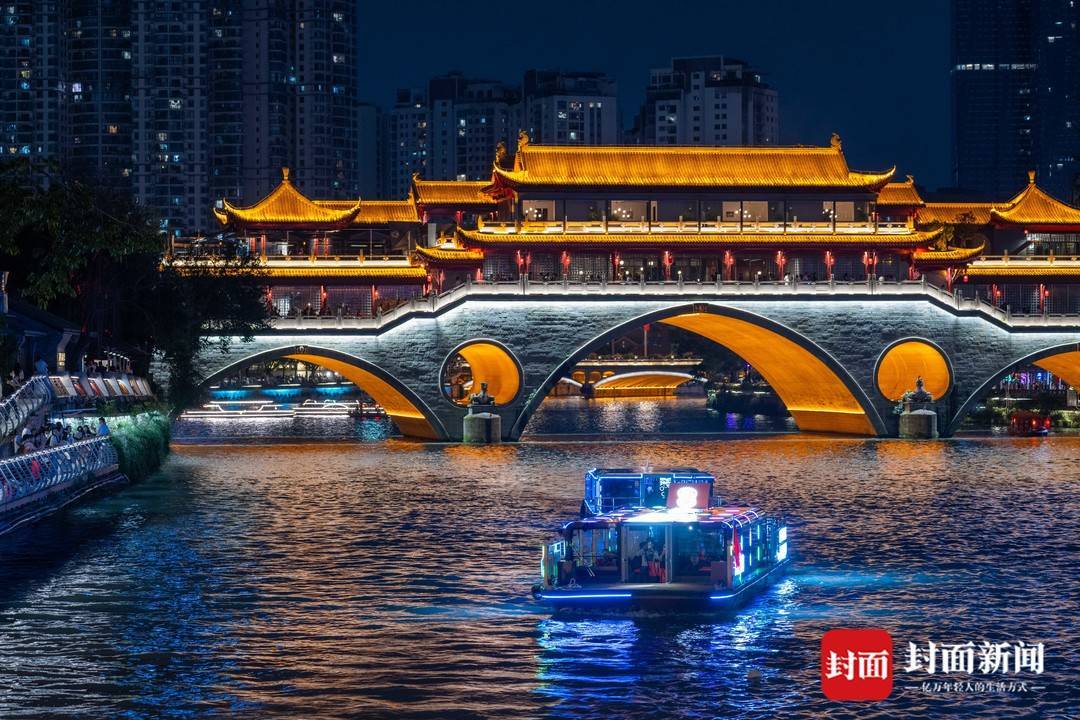 2025年10月2日,成都锦江合江亭段,市民和游客乘船欣赏锦江两岸夜景。