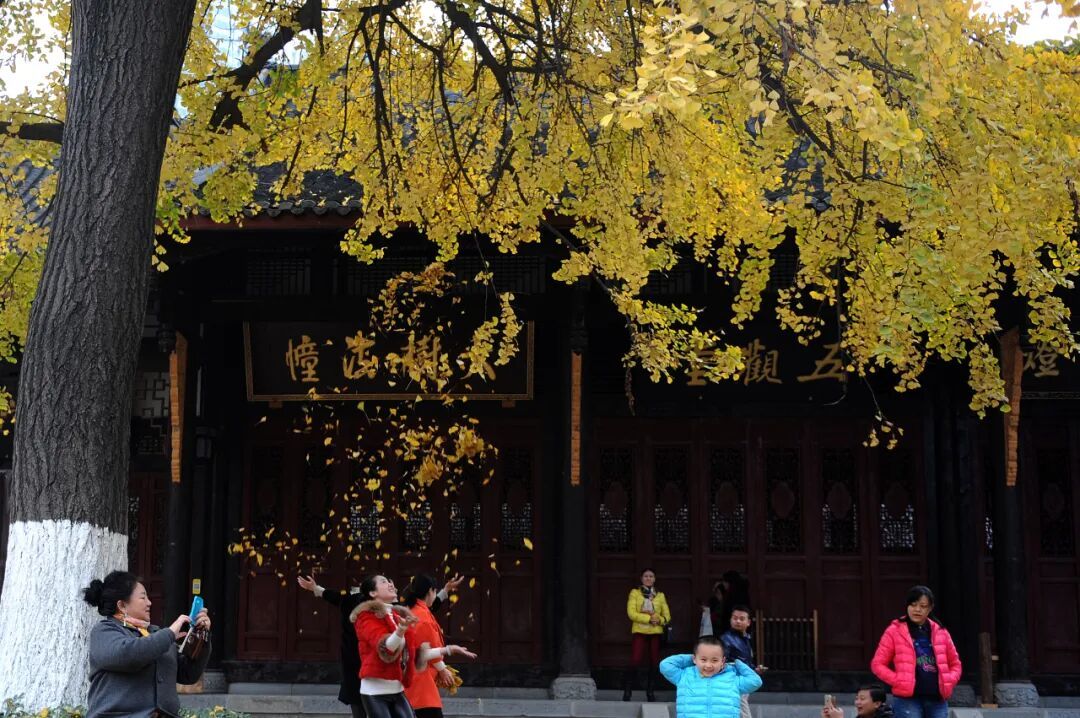 (大慈寺内的银杏在阳光下熠熠生辉,游客纷纷前来赏景拍照。李杨 摄)