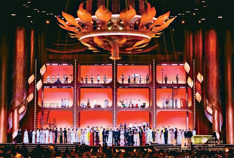 11月15日晚,2025年中国金鸡百花电影节闭幕式暨第38届中国电影金鸡奖颁奖典礼在厦门海峡大剧院举行。本届电影节聚焦“场景中的新时代、作品中的新大众、光影中的新观念”,在致敬百廿光影的精神传承与文化传统的同时,生动诠释了“电影何为”的时代命题,凸显了金鸡奖鼓励艺术创新、扎根人民生活、抒写时代气象的价值内核。图为典礼现场。 中国电影家协会供图