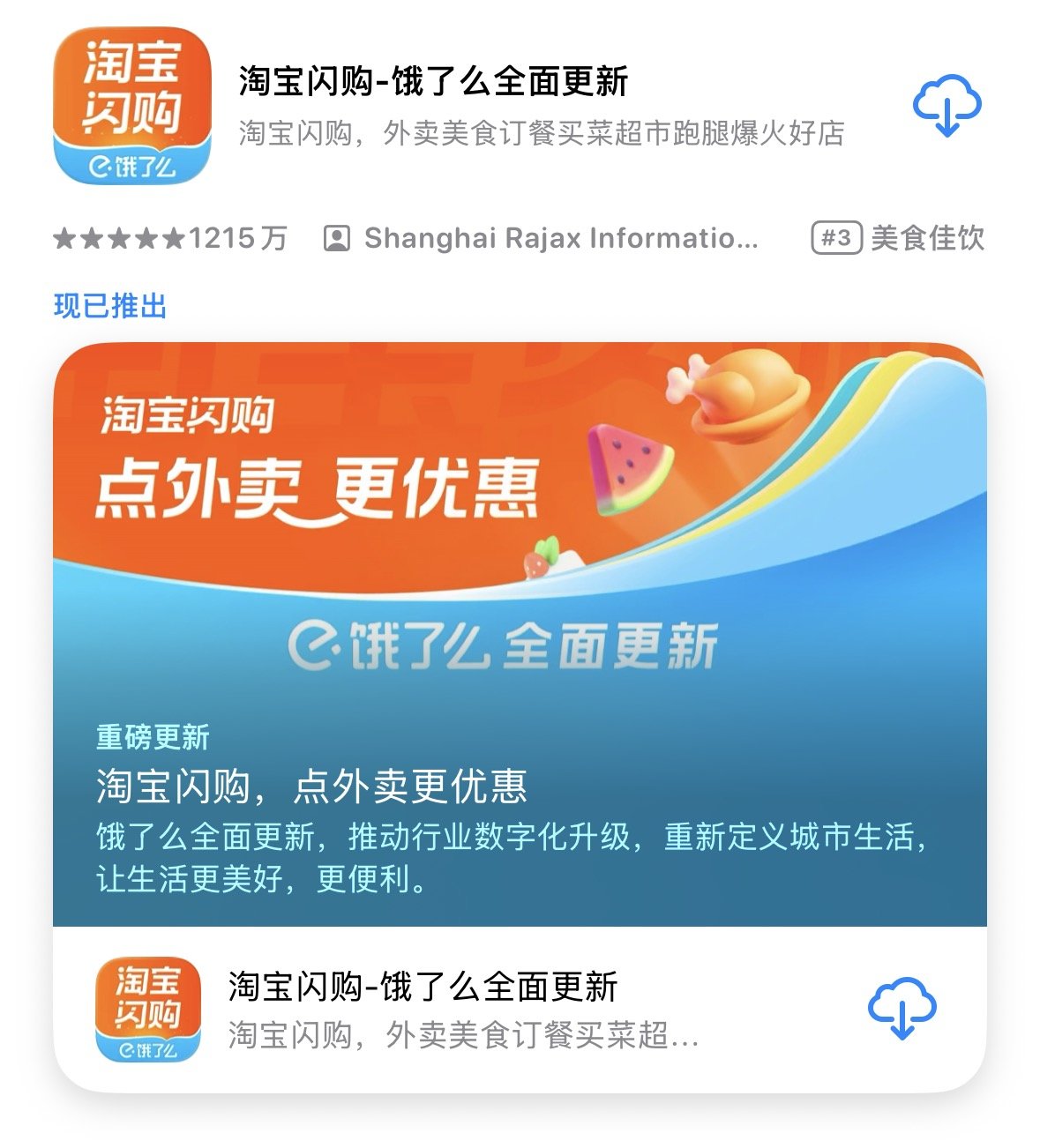 金融投资报记者发现,在苹果App Store中,原“饿了么”App已不在,更新后已是“淘宝闪购”App。此前,不少原“饿了么”外卖骑手的工作服,也已从蓝色冲锋衣更换为“淘宝闪购”的橙色冲锋衣。