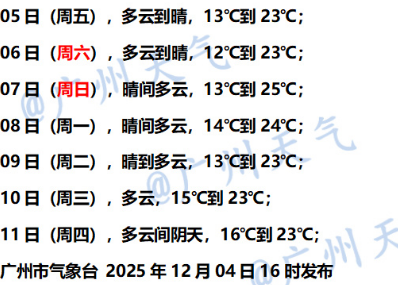 广州市气象台预计,12月5日—9日广州以晴朗干燥天气为主,最低气温12~14℃,最高气温23~25℃。12月10日起云量增多,最低气温回升。