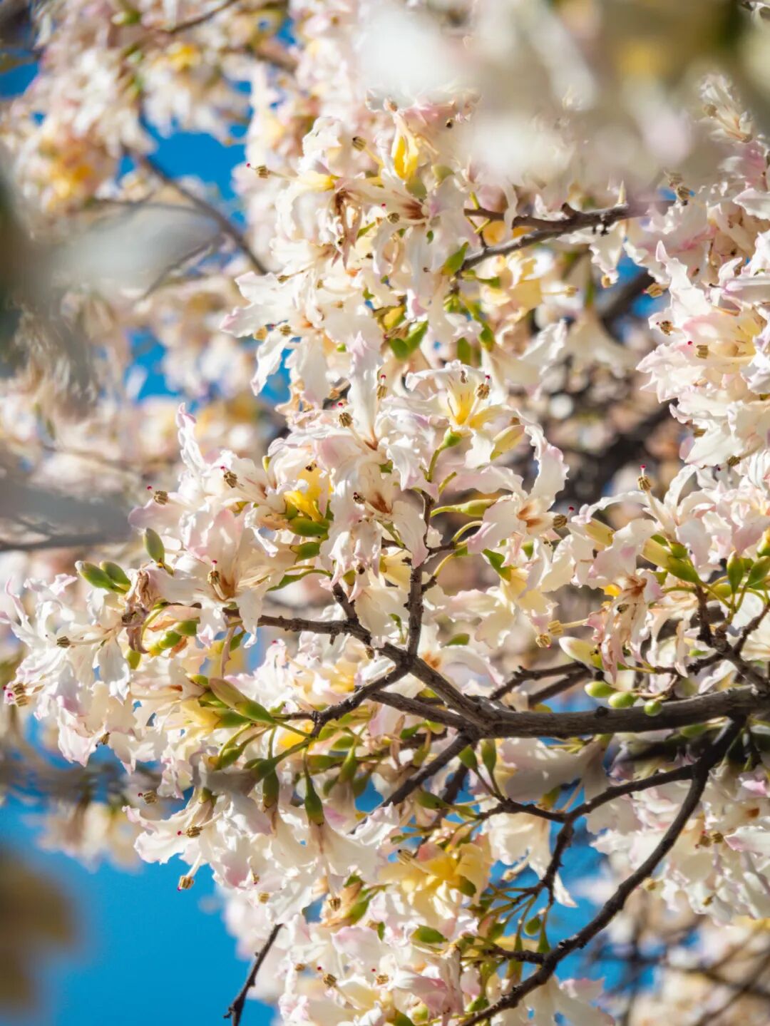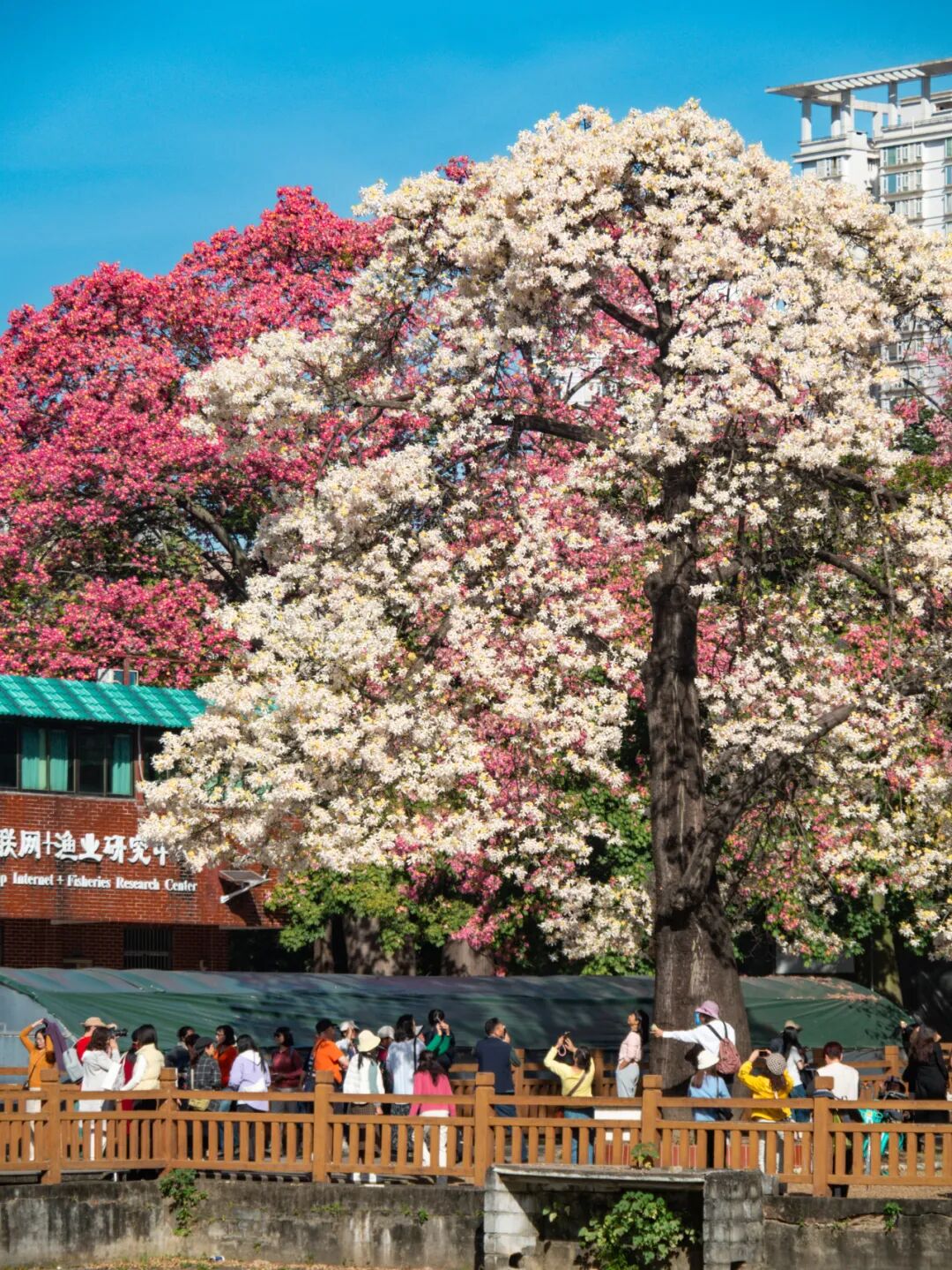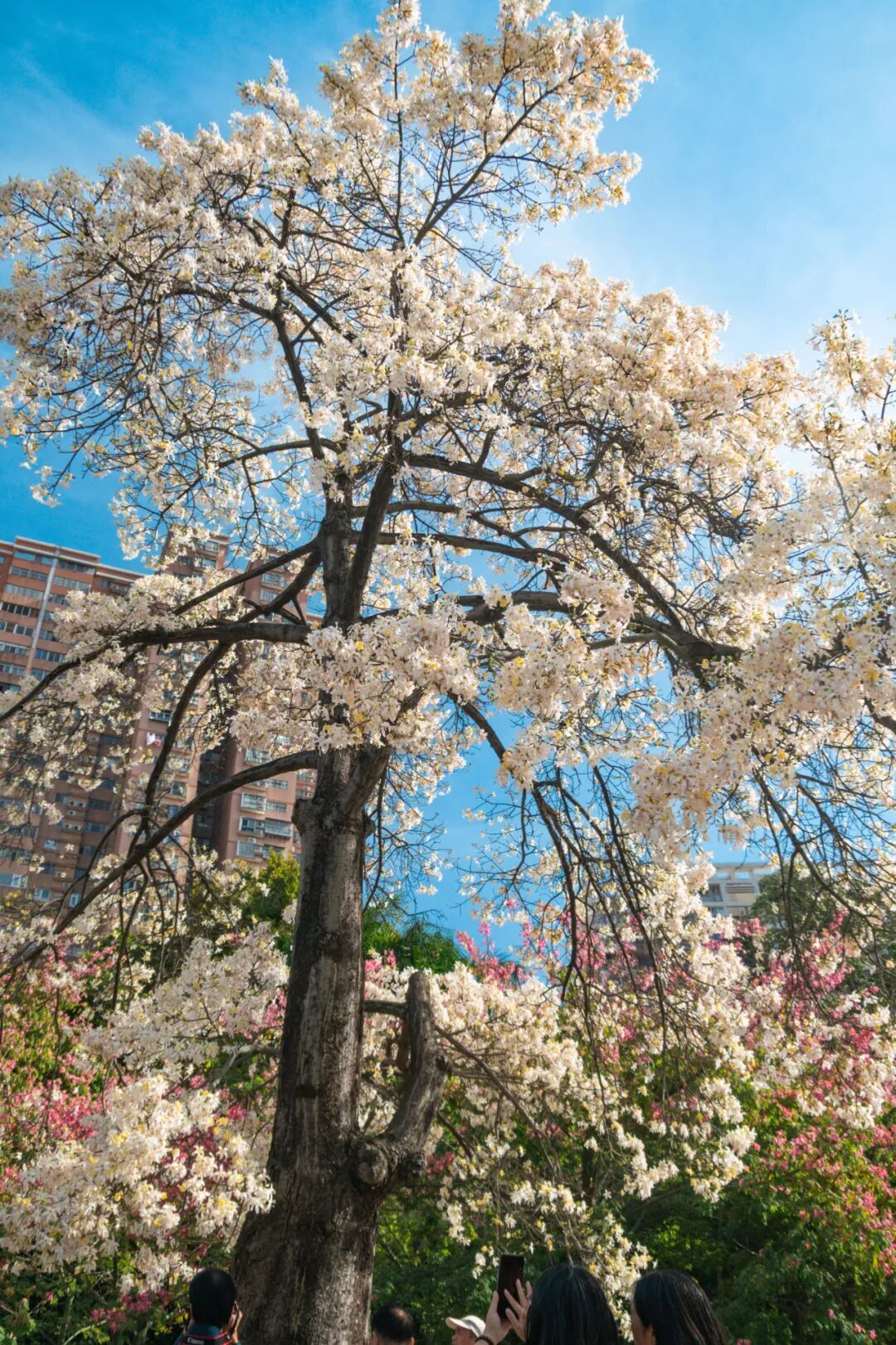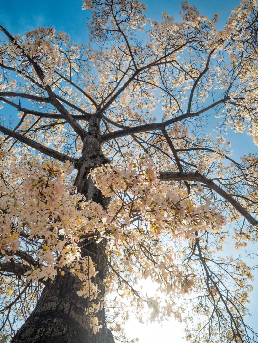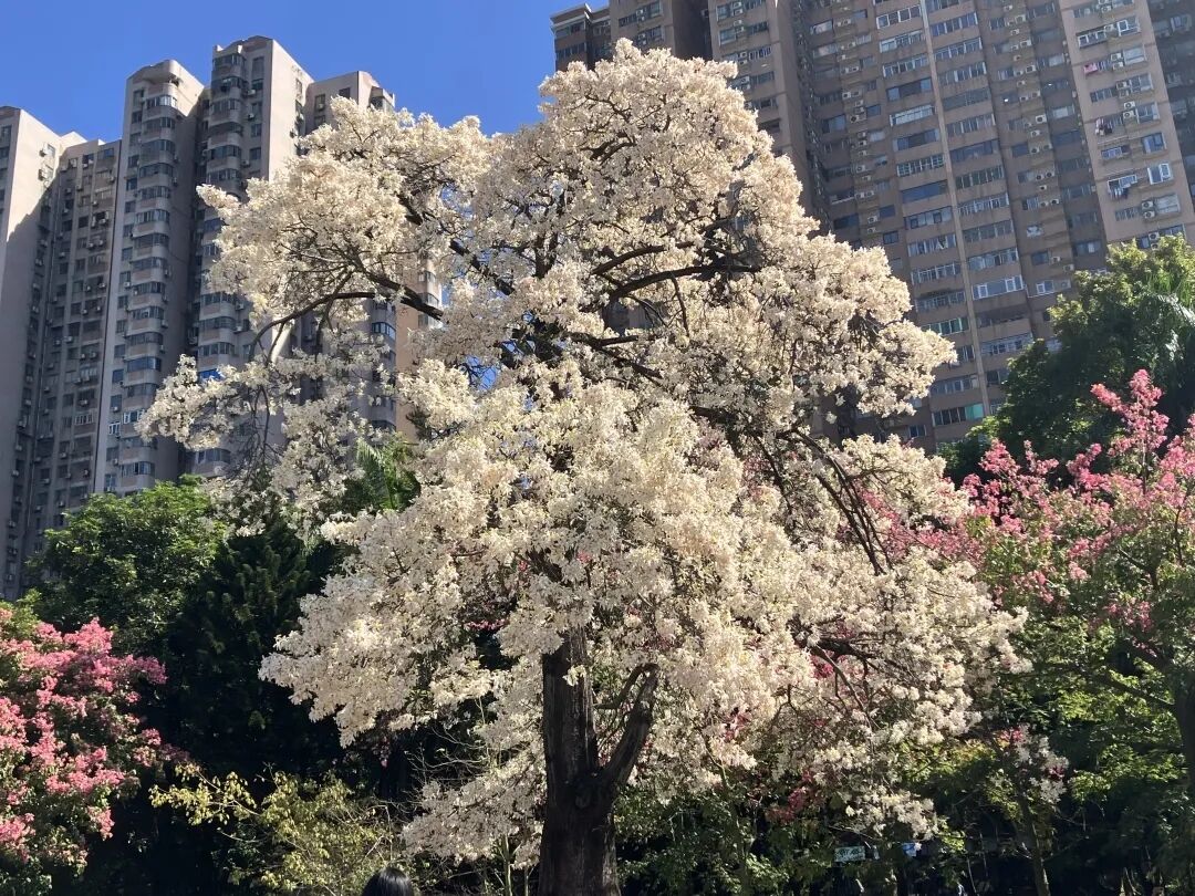 每年11月中下旬至12月初,白花美丽异木棉迎来它的盛花期,相较于粉色品种的美丽异木棉,这棵树开花要稍晚一点。