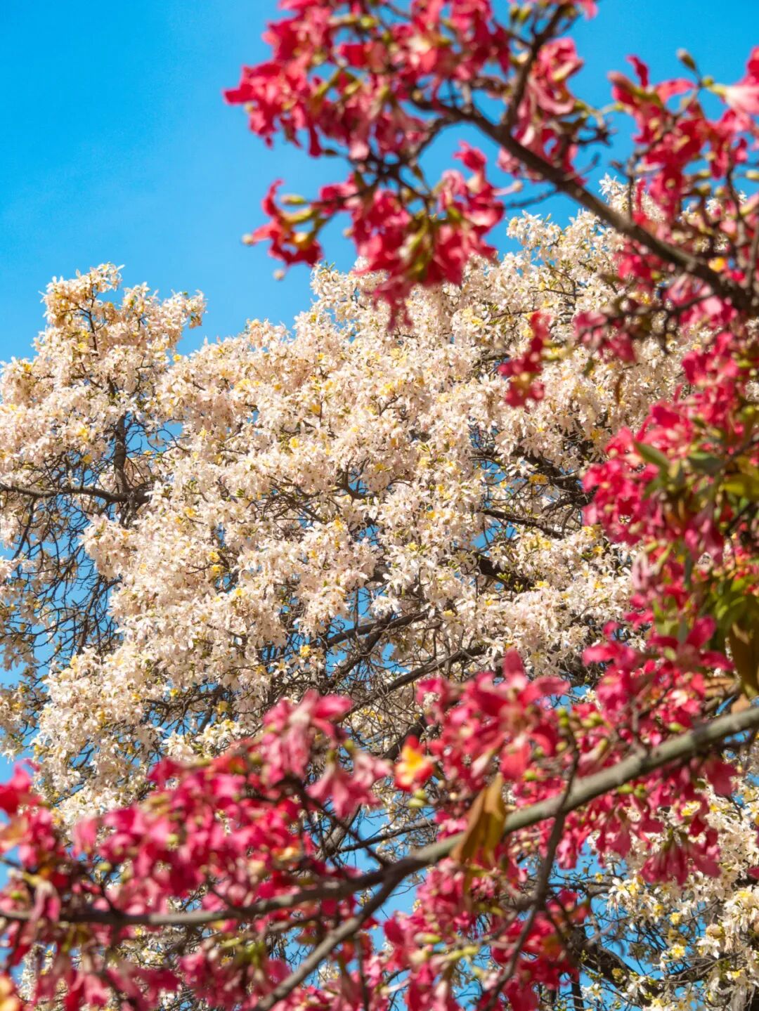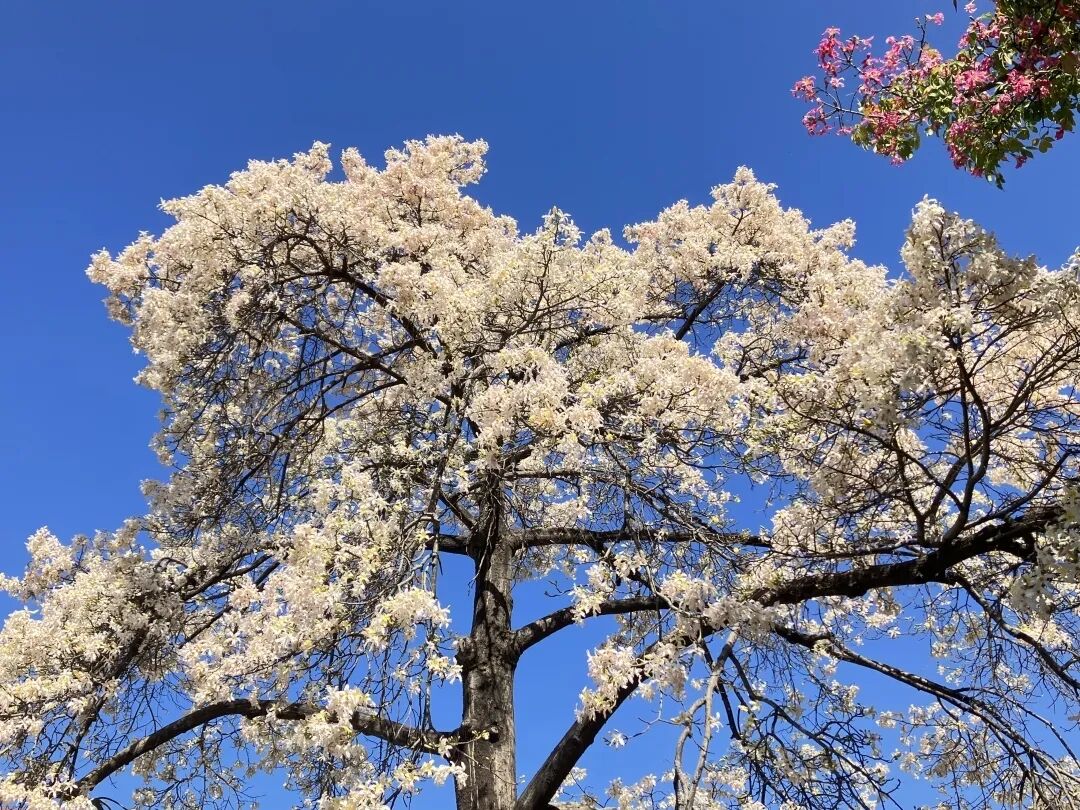 满树纯净的白花在阳光下如雪花般晶莹,与周围粉花异木棉交织,构成粉白相间的梦幻画卷。