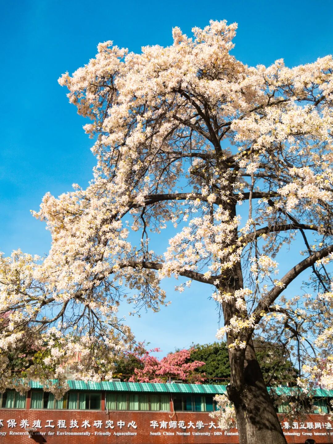 这棵白花美丽异木棉位于华南师范大学广州校区石牌校园内,具体位置在生物园及科研实验基地附近的水塘边。