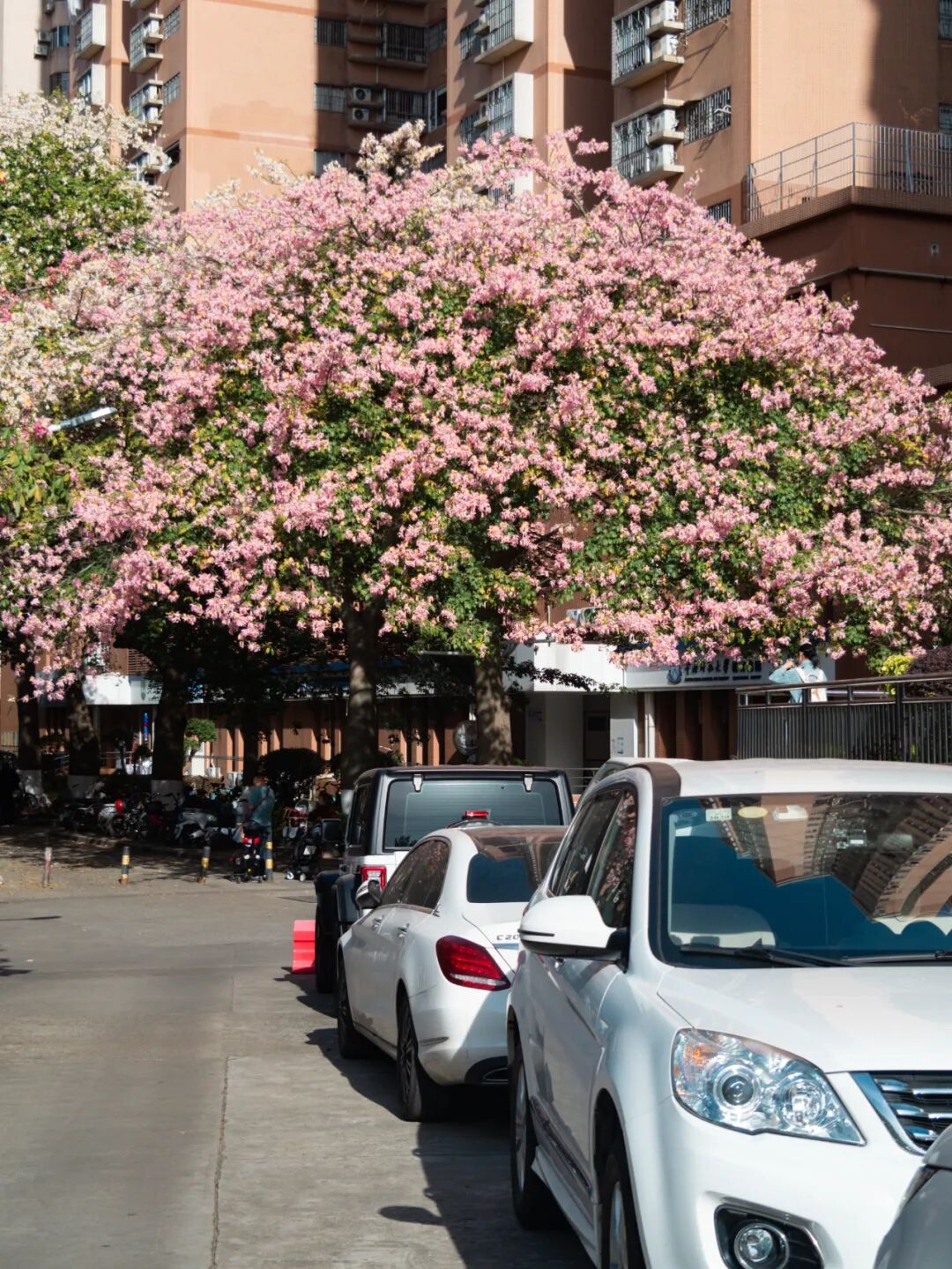 白花异木棉树下游客不断,