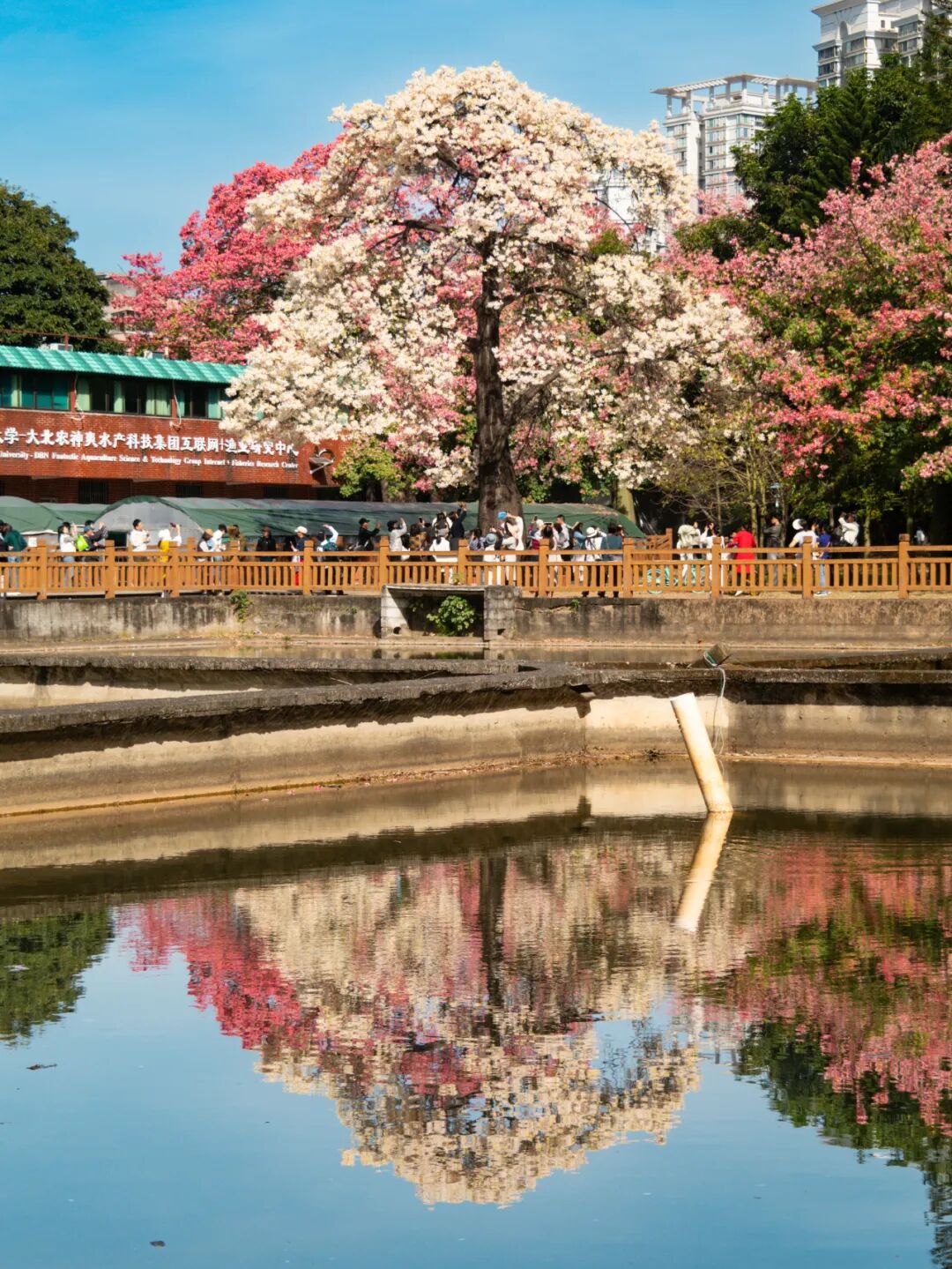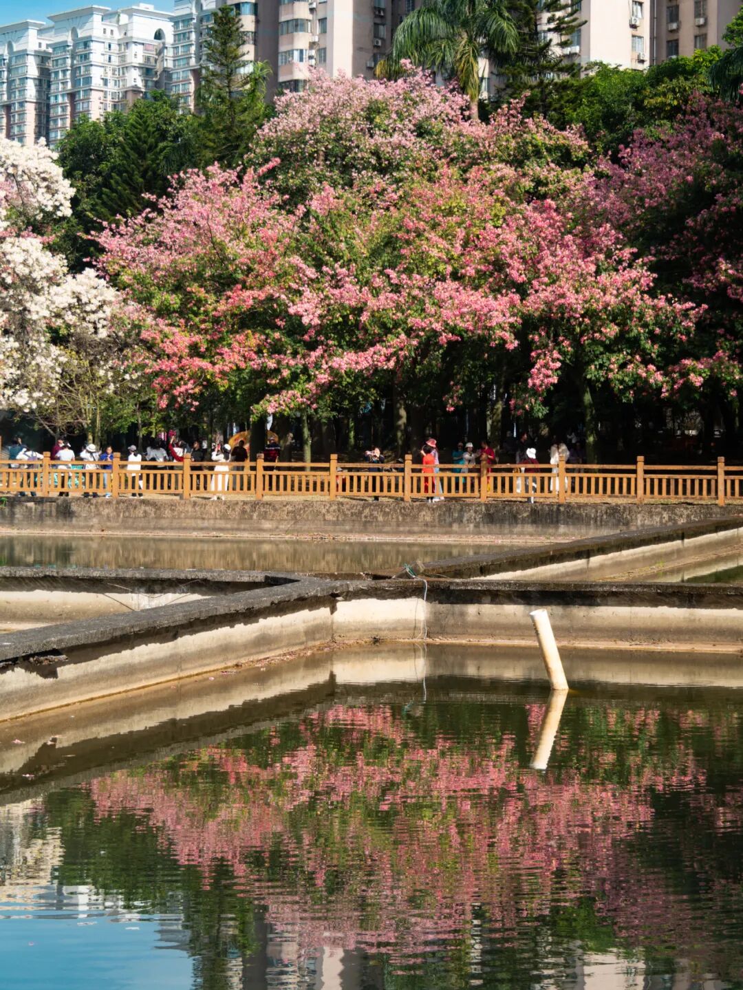 广州日报新花城记者来到现场,远远就能看见高大花树的倒影与池水相映,白色花朵与周围绿植、楼宇“同框”。
