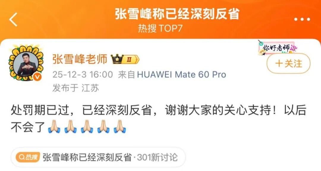16时许,张雪峰在其微博回应此事:处罚期已过,已经深刻反省,谢谢大家的关心支持!以后不会了。