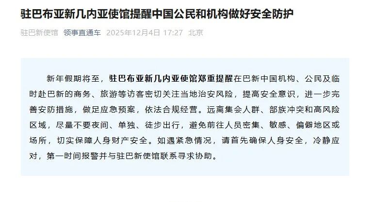 驻巴布亚新几内亚使馆提醒中国公民和机构做好安全防护 新年假期将至,驻巴布亚新几内亚使馆郑重提醒在巴新中国机构、公民及临时赴巴新的商务、旅游等访客密切关注当地治安风险,提高安全意识,进一步完善安防措施,做足应急预案,依法合规经营。远离集会人群、部族冲突和高风险区域,尽量不要夜间、单独、徒步出行,避免前往人员密集、敏感、偏僻地区或场所,切实保障人身财产安全。如遇紧急情况,请首先确保人身安全,冷静应对,第一时间报警并与驻巴新使馆联系寻求协助。