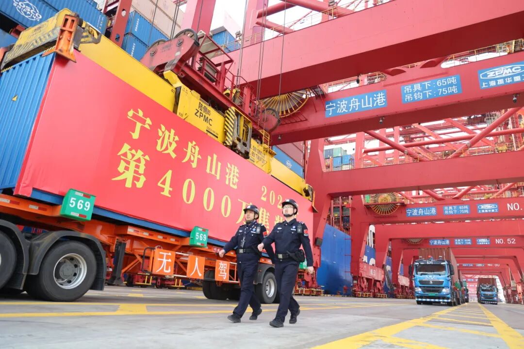 3、浙江宁波舟山港年集装箱吞吐量首次突破4000万标准箱 12月2日,浙江宁波舟山港年集装箱吞吐量首次突破4000万标准箱,成为我国第二个、世界第三个突破4000万大关的港口。浙江边检总站宁波边检站主动靠前服务,实现船舶靠泊“零等待”、装卸作业“零延迟”,全力服务保障驻地经济发展。(文:许桃/图:雷秉融)