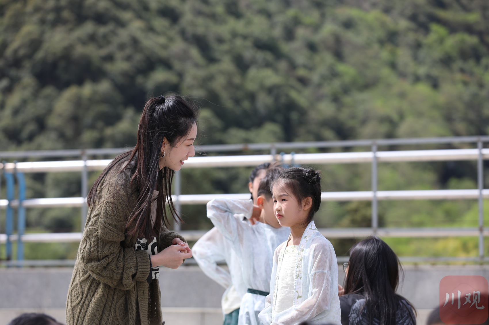 谭淇尹(左一)在和孩子们交流。何勤华 摄